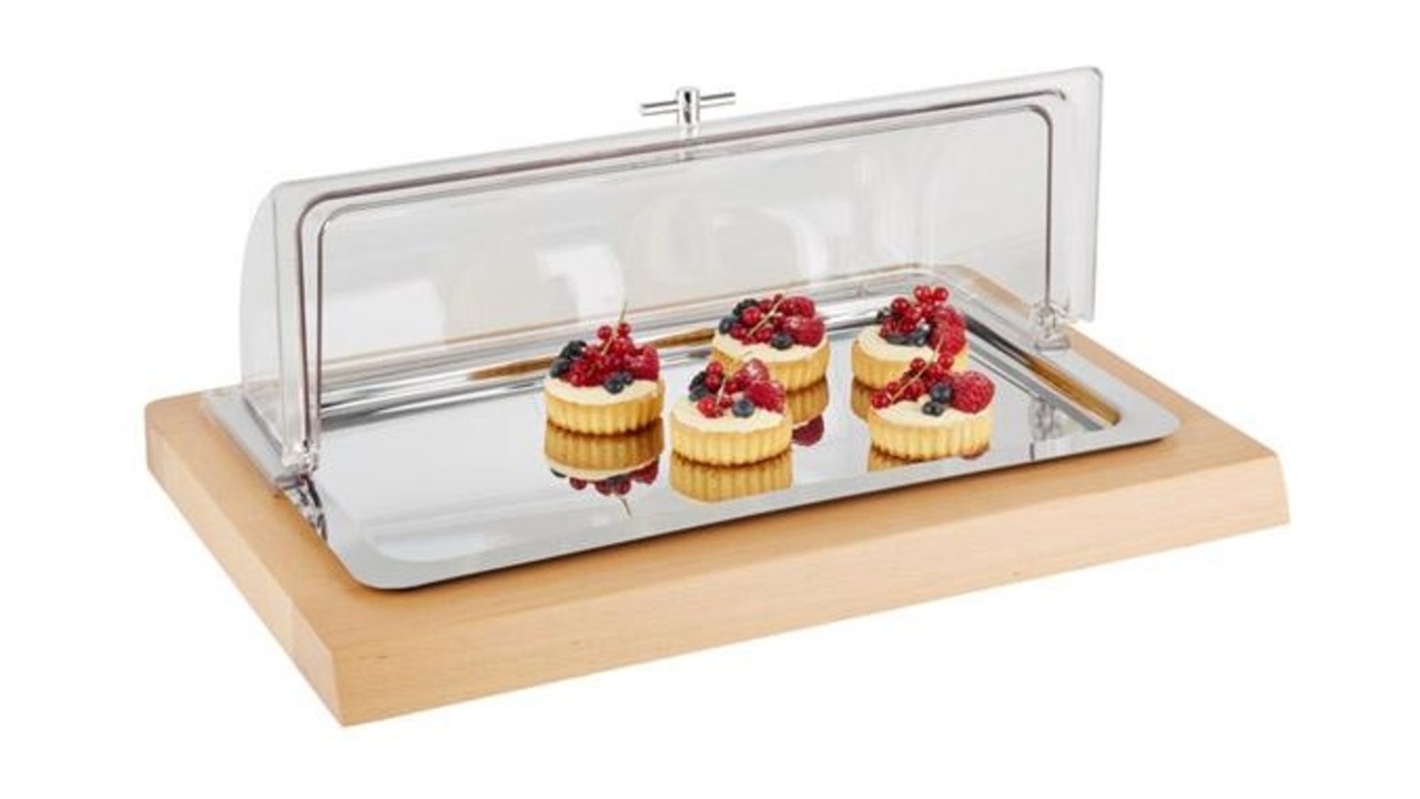 Buffet set including 1 stainless steel tray GN 1/1, wooden underliner waterproof, 1 roll-top lid with chrome-plated handle and 2 cooling elements.
