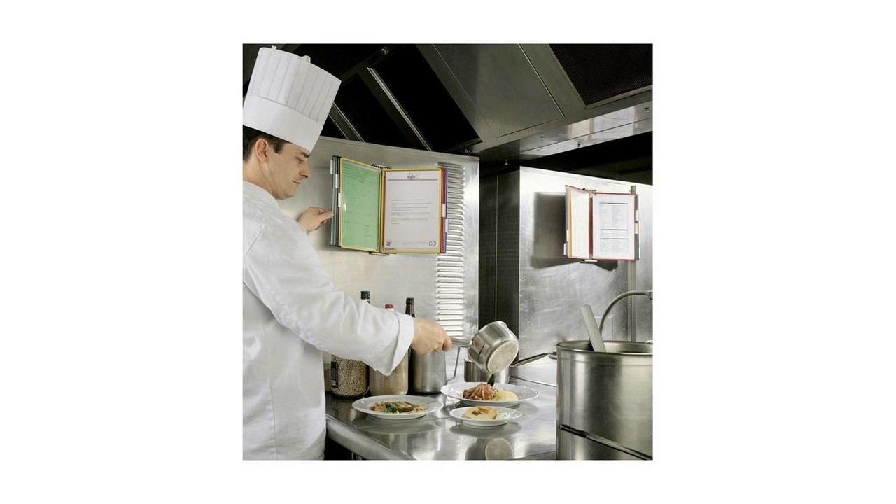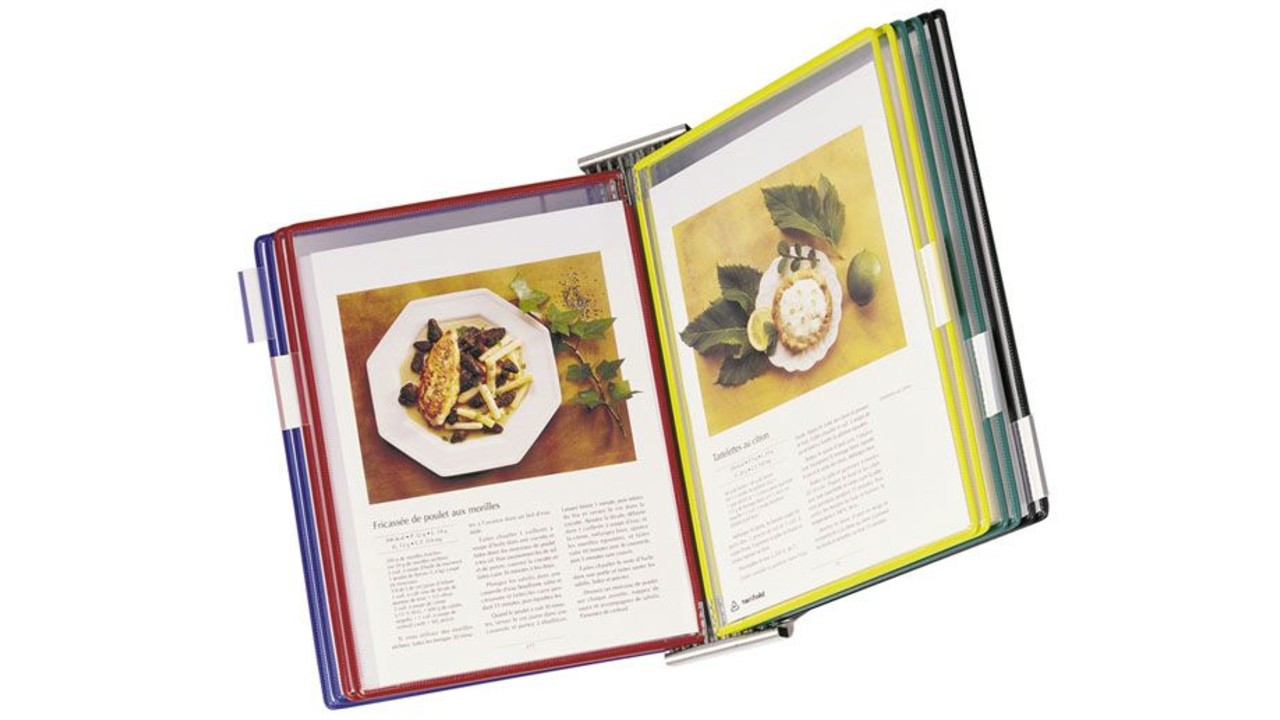 This recipe holder has one stainless steel holder to attach to the wall, 10 transparent vision folders and 5 colored frames. This set comes with the necessary screws and mounting hardware