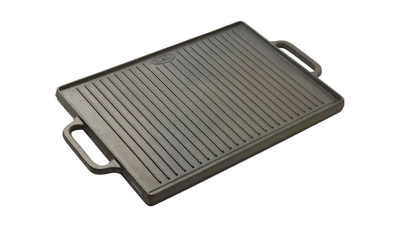 Cast iron made, one side slick ( plancha ) one side grooved ( griddle ) with 2 handles