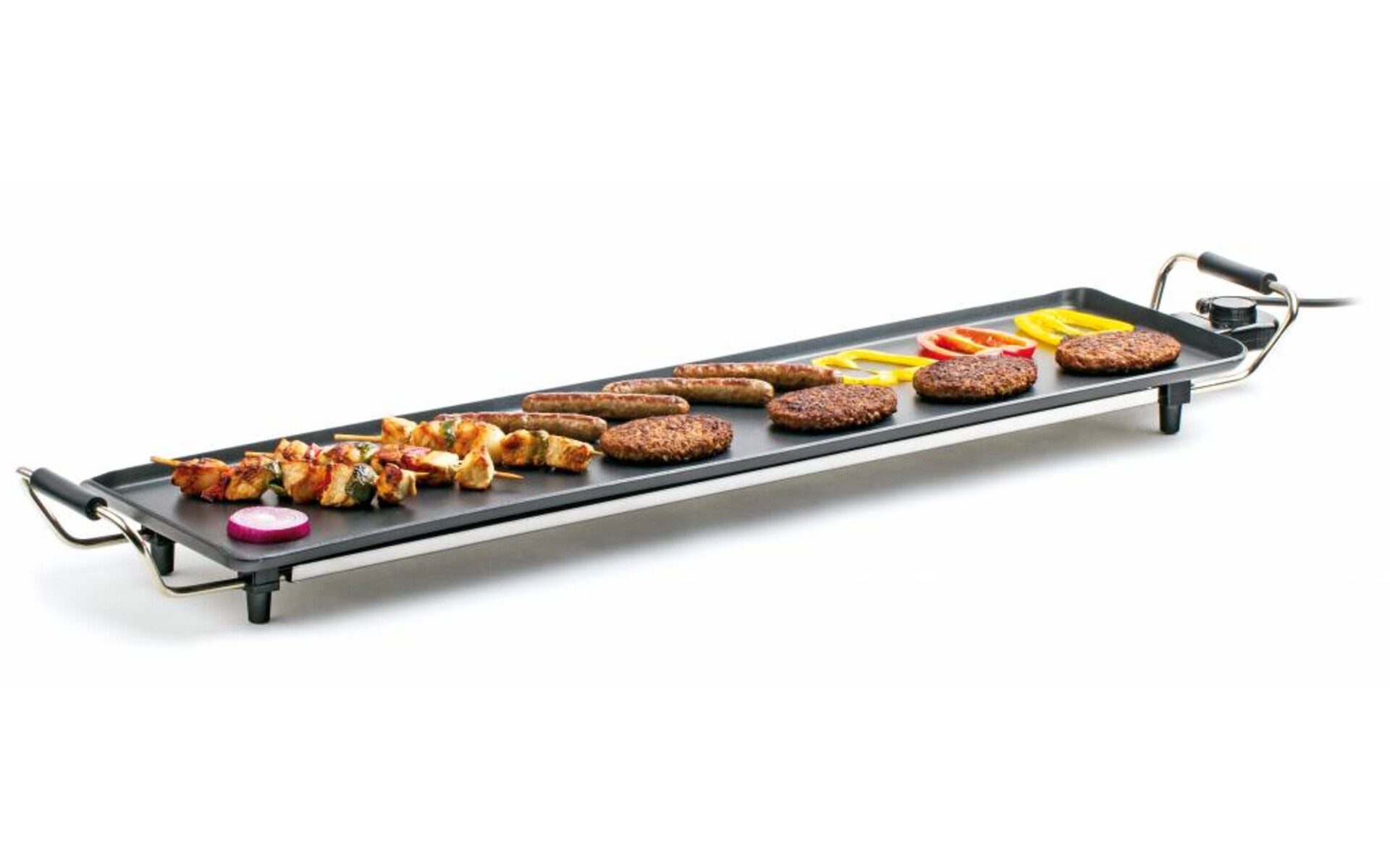 Detachable, steplessly adjustable plug thermostat. Sturdy handles for safe transport. The Tepan-Yaki griddle is easy to clean. Griddle surface features a non-stick coating. • Griddle surface dimensions: 893x217mm.