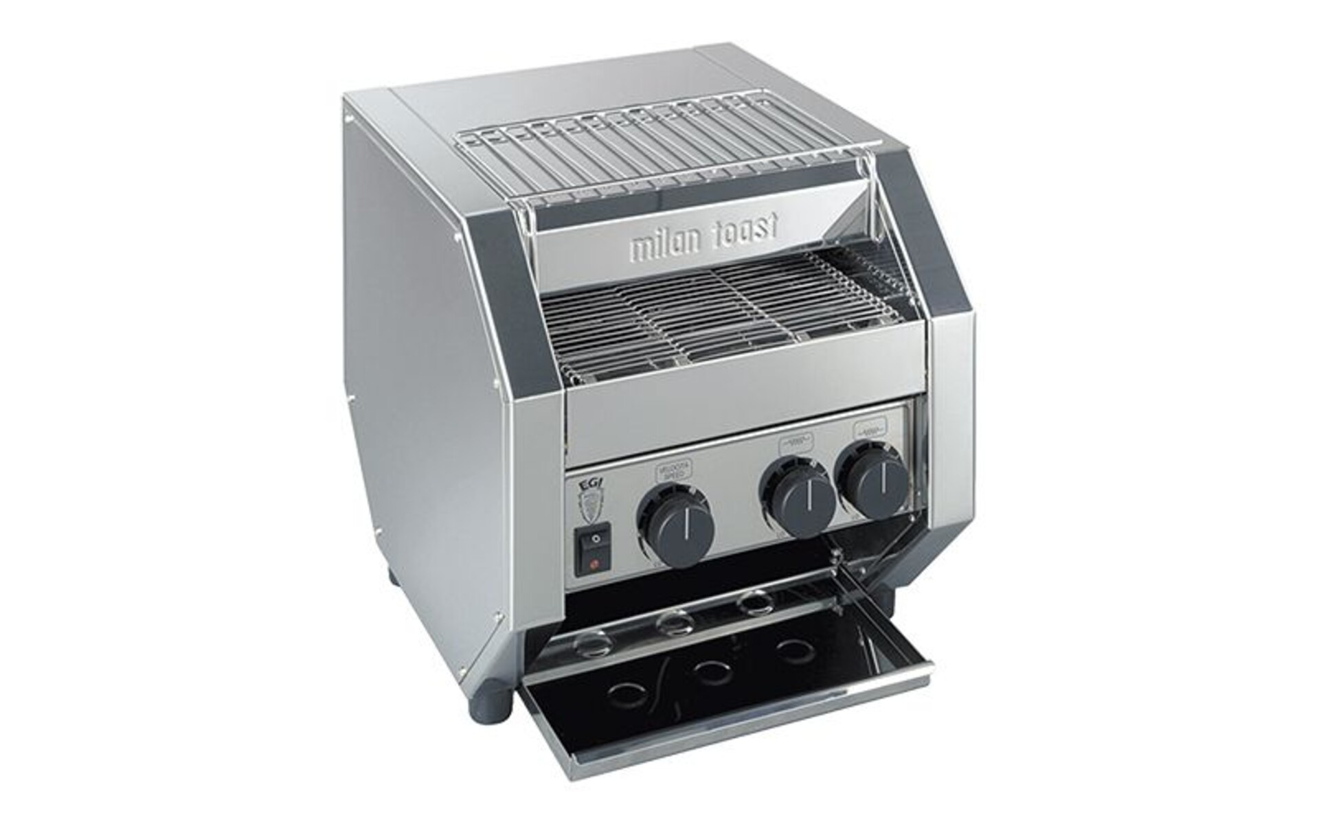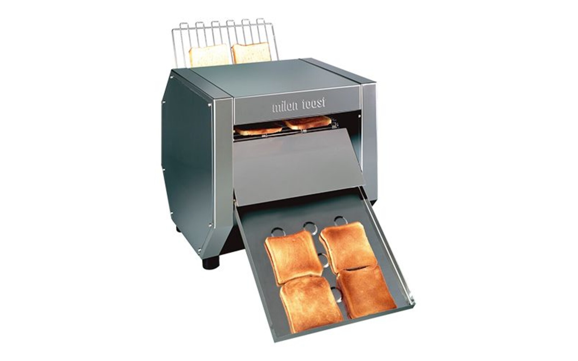 All stainless steel construction. Toast color can be determined by conveyor speed as well as by independently and thermostatically controlled heating elements. Units are fully insulated to emit only minimal heat to surroundings. Interior product holding tray provides better temperature maintenance. With lighted main power rocker switch. The CONVEYOR TOASTERS can be used for bread as well as for buns (for e.g. hamburgers). The toasting belt is suitable for two rows of toast