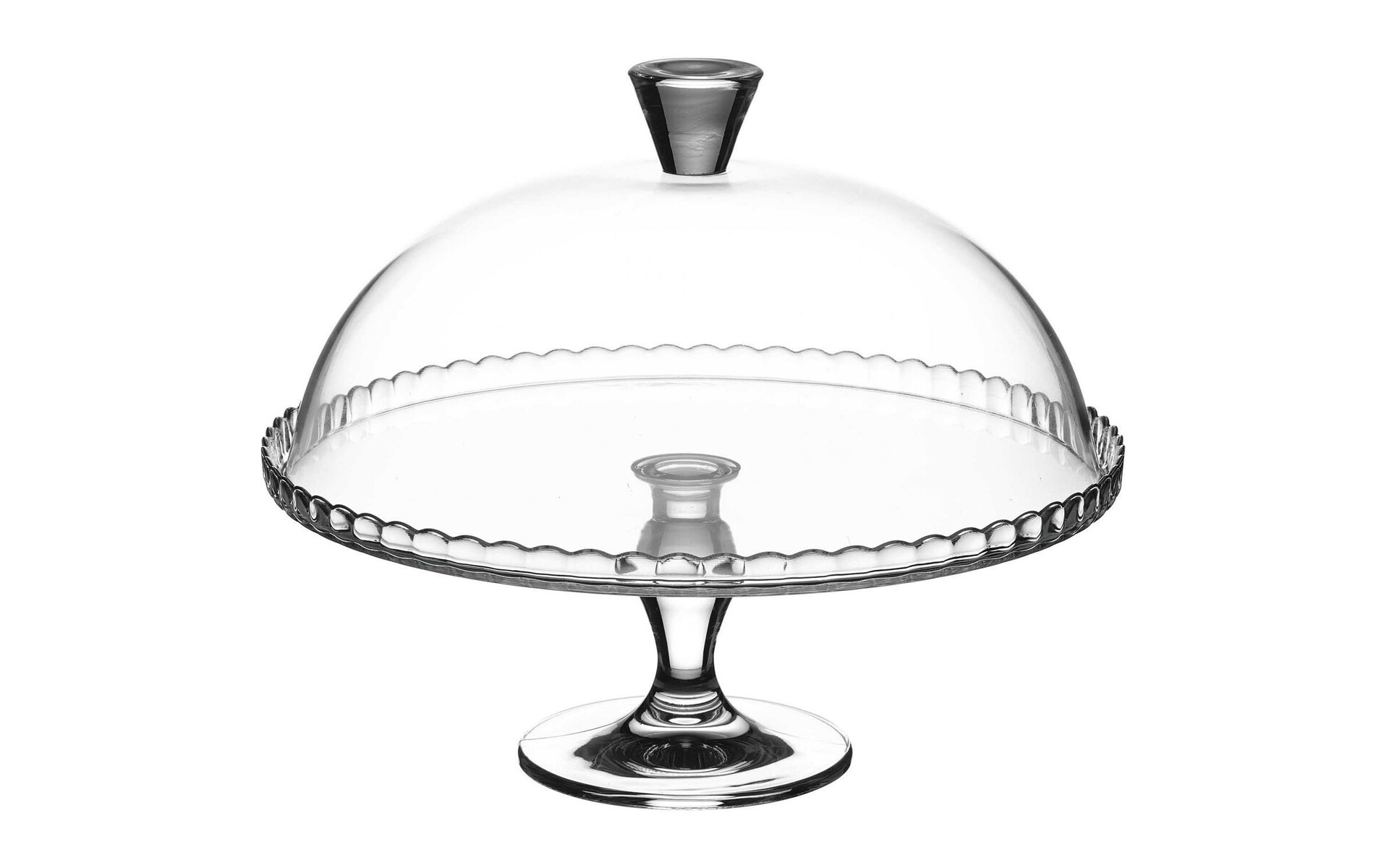 A cake stand, ideal for displaying or serving a dessert or cake. This patisserie glass cake stand and dome is a modern take on the classic glass cake stand. Stylish, but subtle, details add charm to this cake stand and the glass cloche keeps desserts, petit fours, mini cakes muffins, meringues, macaroons or fruit, fresh for longer. The perfect combination of style and functionality. Can be used on buffets.