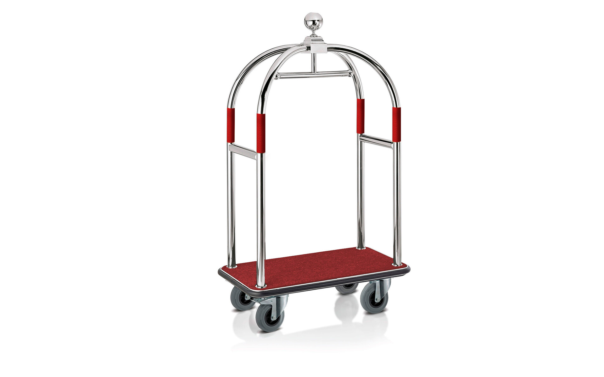 The Paris luggage trolley features a brushed stainless steel frame with carpet platform, protective sleeves, and a rubber bumper. Silent Ø200 mm wheels (2 fixed, 2 swivel with brakes) ensure smooth handling, with a coat rail for convenience.
