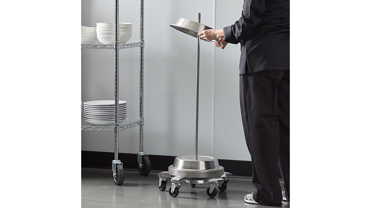 Transporting your plate covers in bulk has never been simpler with this trolley made of aluminum. Able to accommodate up to 175 plate covers, this cart ensures speedy service! The base is 20" in diameter and made of sturdy aluminum to ensure that you'll be able to safely and efficiently transfer your plate covers. A steel screw-in bar adds to the durability of this cart and ensures that your plate covers will stay in place.