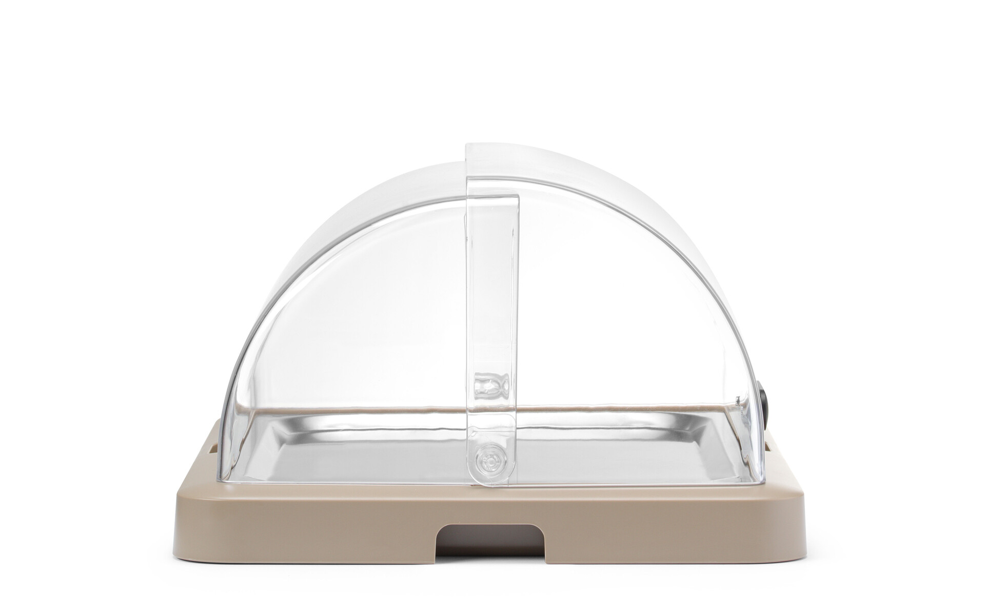 Transparent PET roll-top lid allows selection of food without lifting the cover.