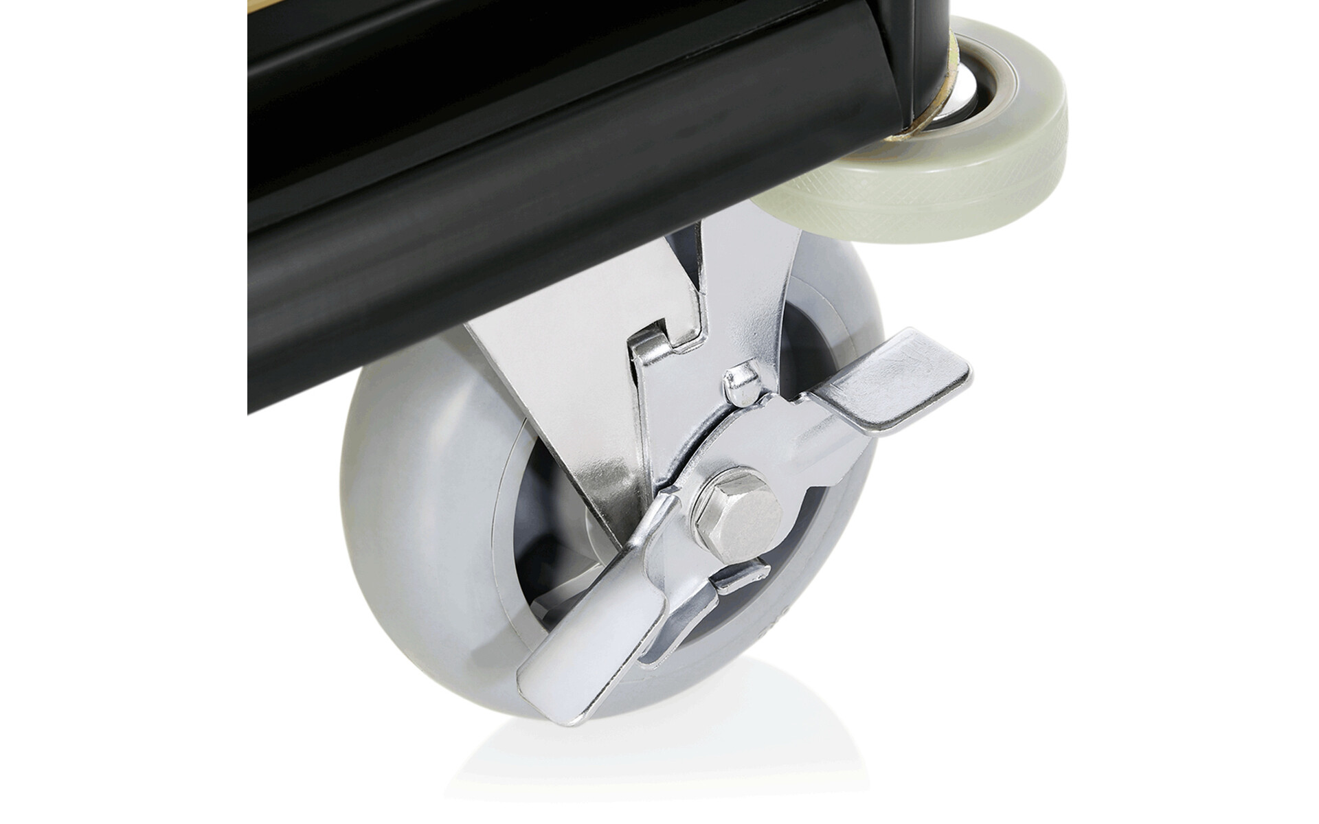 2 swivel wheels Ø 15 cm, with brake and 2 fixed castors.