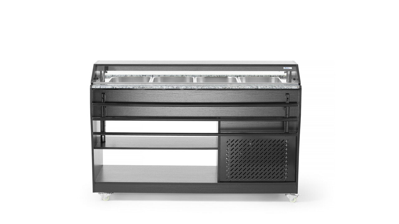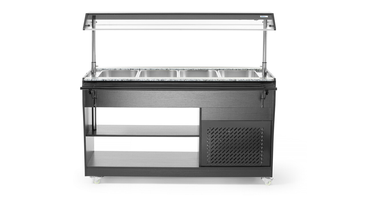 The Arktic Salad buffet has space for 4 GN 1/1 containers, which are included in the set. The buffet is equipped with lighting in the canopy, has 2 shelves underneath for storing plates and cutlery and is easy to move thanks to 4 castors.