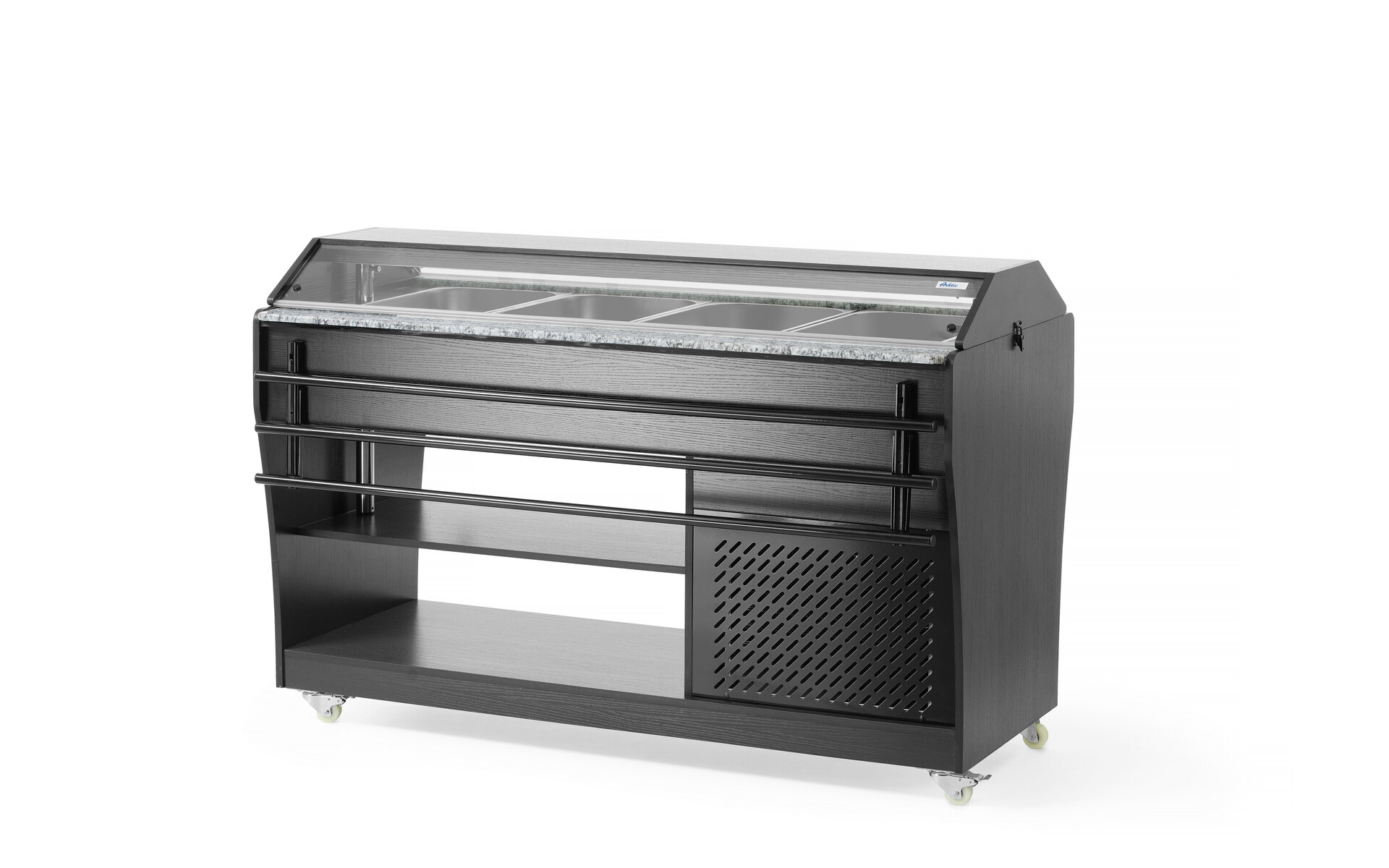 The Arktic Salad buffet has space for 4 GN 1/1 containers, which are included in the set. The buffet is equipped with lighting in the canopy, has 2 shelves underneath for storing plates and cutlery and is easy to move thanks to 4 castors. This buffet is the ideal solution for self-service establishments or events, as it has a shelf for trays on both sides and ensures that food is kept perfectly cool.