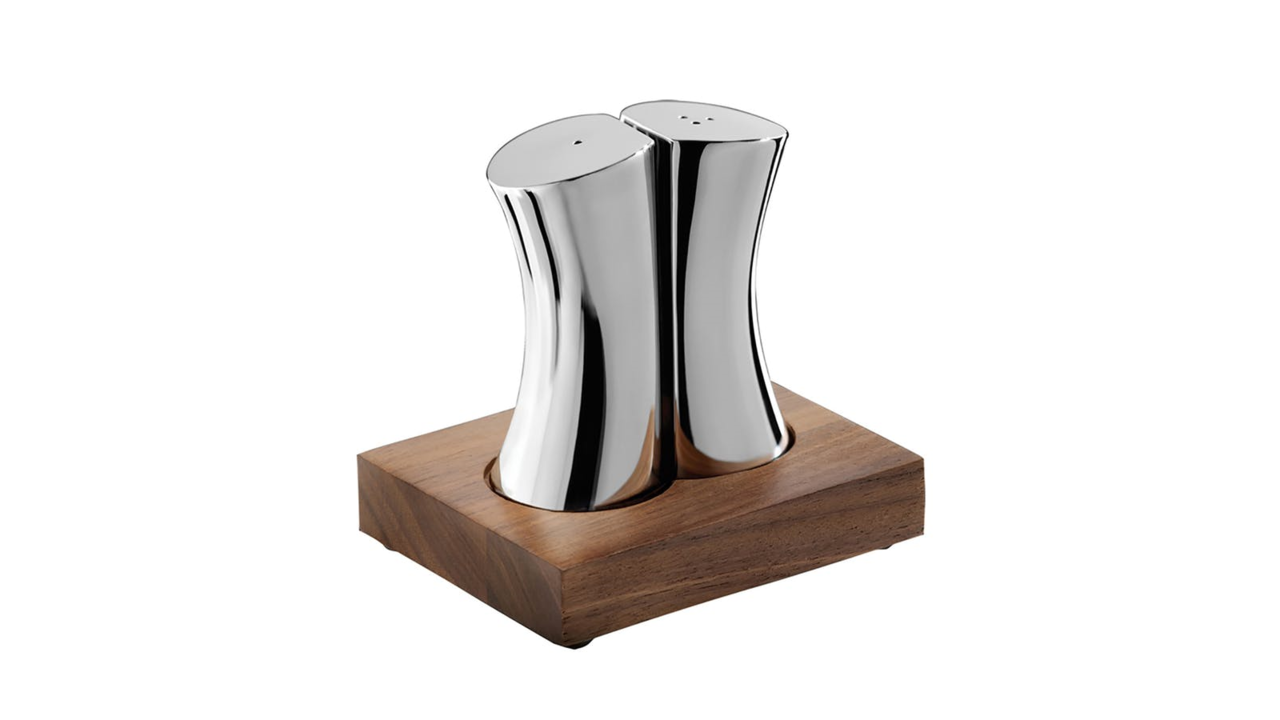 The " Drift " salt and pepper shakers are designed to suggest fluid shapes made of high polished stainless steel with the wooden stand presenting an angular contrast. Excellent on a de luxe restaurant table.