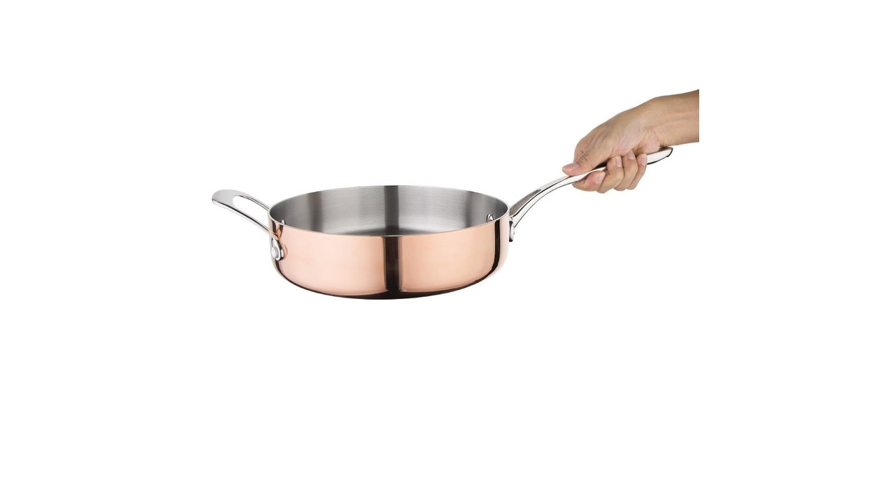 The Vogue Tri Wall Copper Sautepan is made with a triple layer construction consisting of a layer of aluminium between an inner layer of stainless steel and an outer layer or copper. This groundbreaking design gives the pans superior heat conductivity and retention, as well as spreading it out evenly across the pan to cook food quickly and evenly. The pan also features a comfortable, riveted stay-cool handle that keeps your hands free from burns.