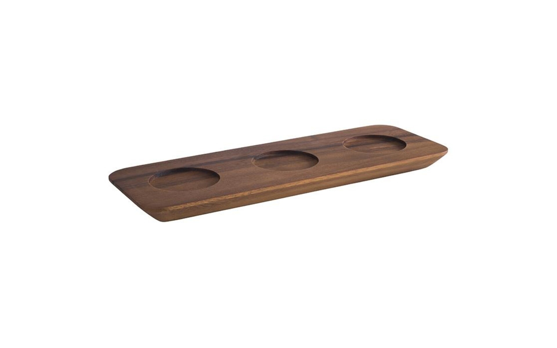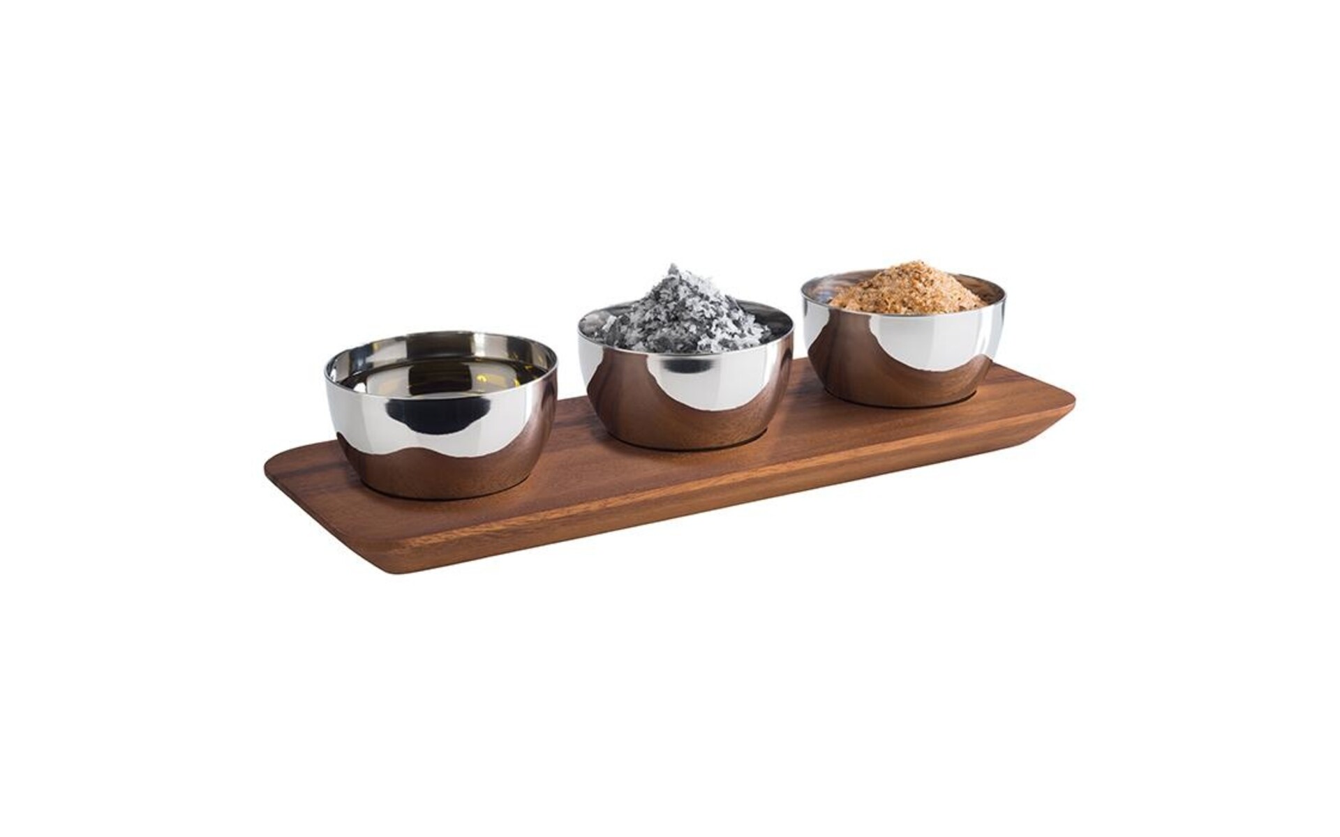This set has an acacia wooden tray 31 x11 cm and 3 small stainless steel bowls content 5 cl, diameter 6 cm height 3 cm Ideal for elegant serving nuts, dip sauses, olives, tapas etc...