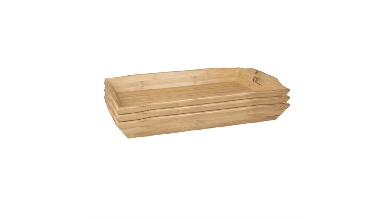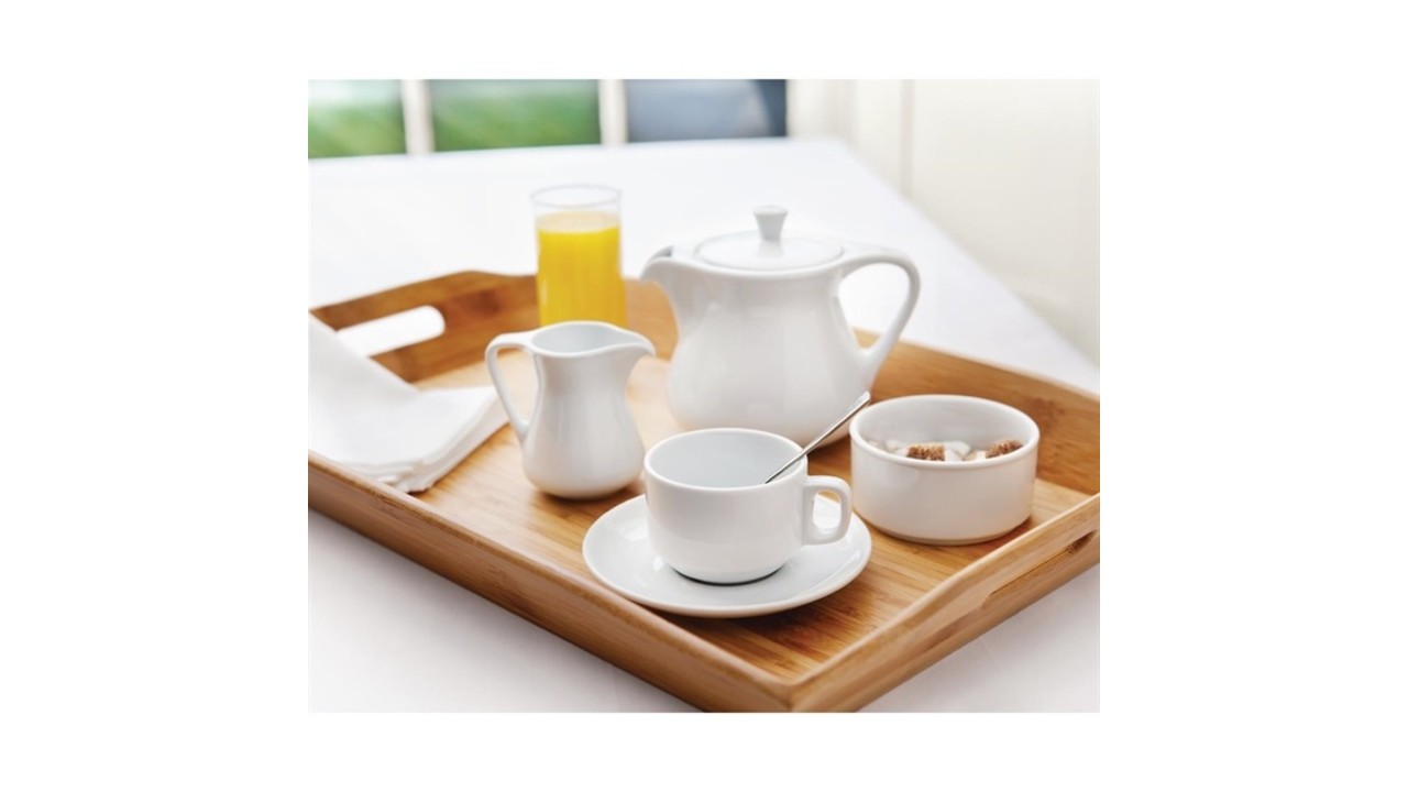 M & T bamboo tray. Made from premium bamboo, this butler tray is exceptionally durable and moisture-resistant, ensuring supreme longevity in any fast-paced hotel or B&B. The bamboo construction also gives this butler tray an extremely luxurious and elegant look, ensuring you always serve in style to truly wow your guests. Designed with two easy-to-hold handles, the tray is remarkably secure in the hand, preventing any drops or spills when carrying food and drink. Raised edges also stop crockery from falling off the sides, further aiding transportation.