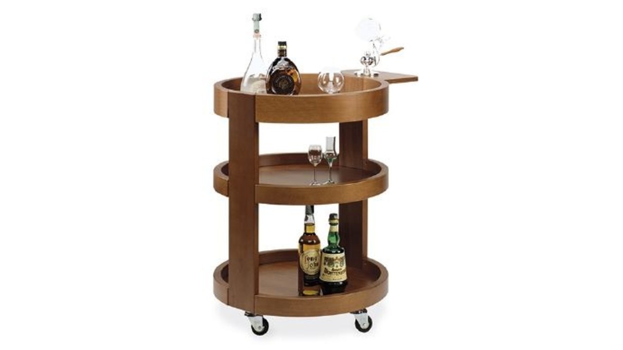 Maximum loading weight : 40 kg. Walnut color. Solid wooden frame. Round plywood shelves. Folding glass support. Swivel castors ø 8 cm.