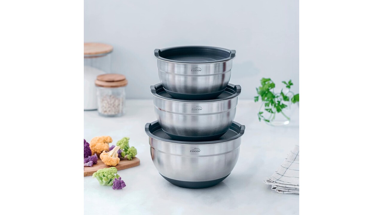Set of 3 bowls made from the highest quality stainless steel Satin interior and exterior finish Ideal for mixing, beating, preparing pasta and serving salads or sauces