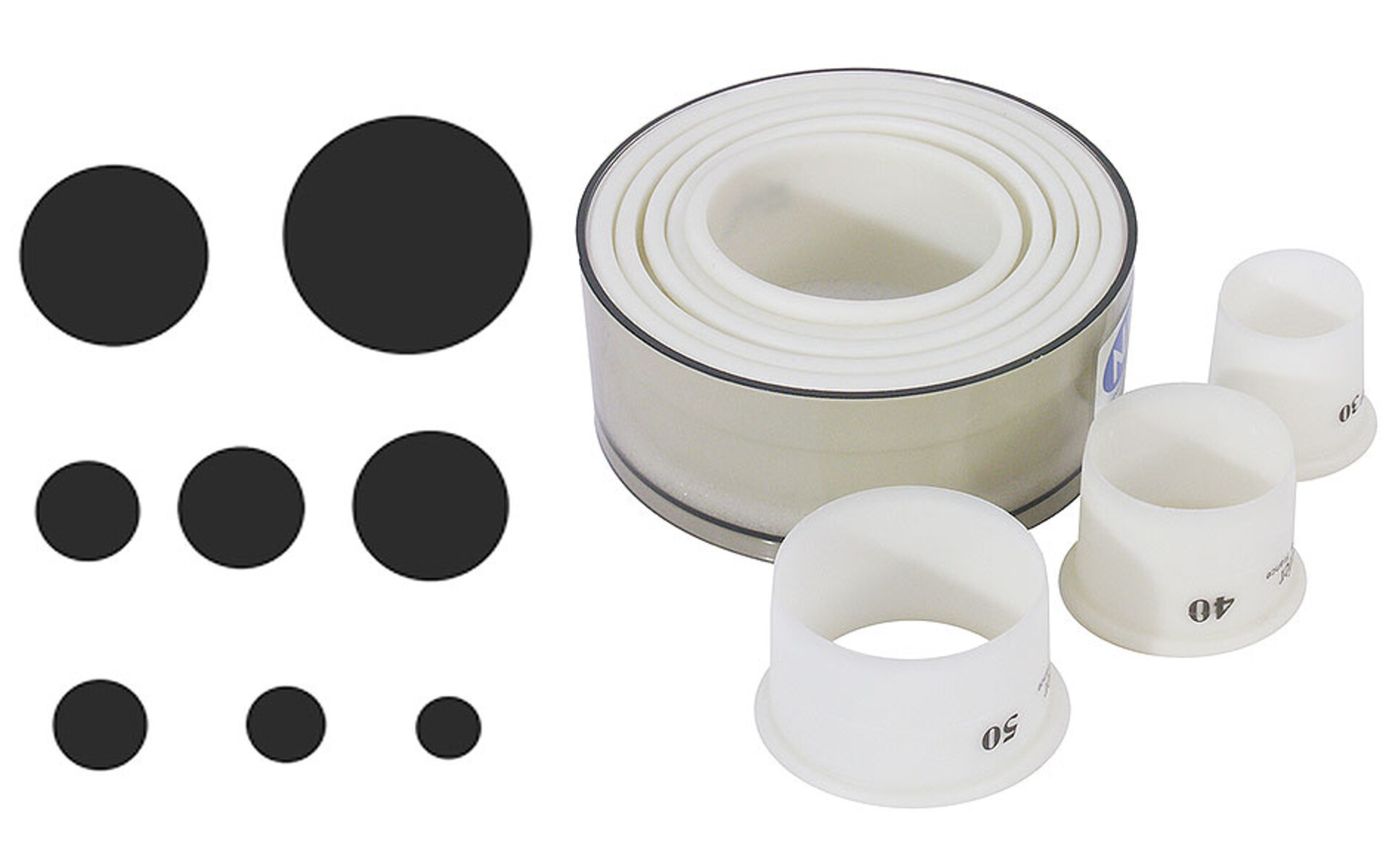 White PA nylon , 9 pieces set round plain . Dimensions : Ø 02, 03, 04, 05, 06, 07, 08, 09,10 cm . Height 3,5 cm. Heat resistant up to + 40° C . Virtually unbreakable.
