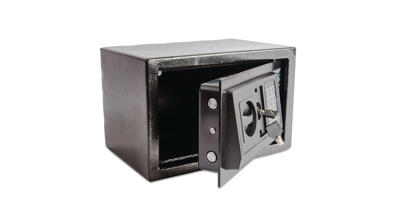 Steel safe for storing valuable belongings such as wallets and passports. Suitable for wall or floor mounting, supplied with 2 emergency keys, 4 AA batteries, and all mounting hardware, and equipped with an information panel for guests.