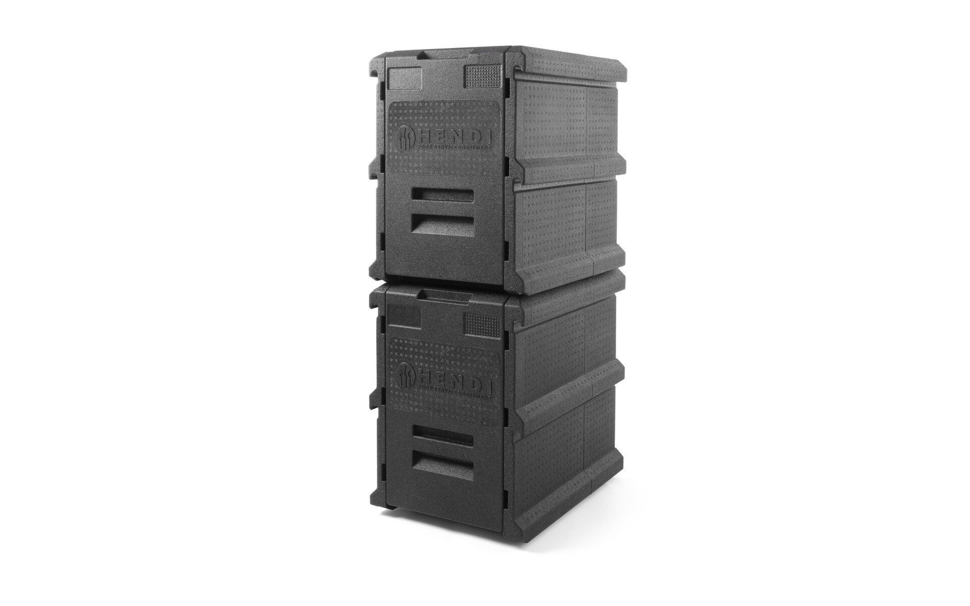 Inside dimensions : 55 x 33,5 x h 54,5 cm . Outside dimensions : 63,5 x 46,5 x h 66 cm . Content : 100 liter. Thermal front loader. Stackable. Made of EPP (expanded polypropylene).