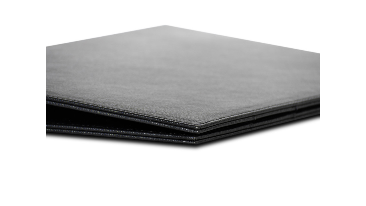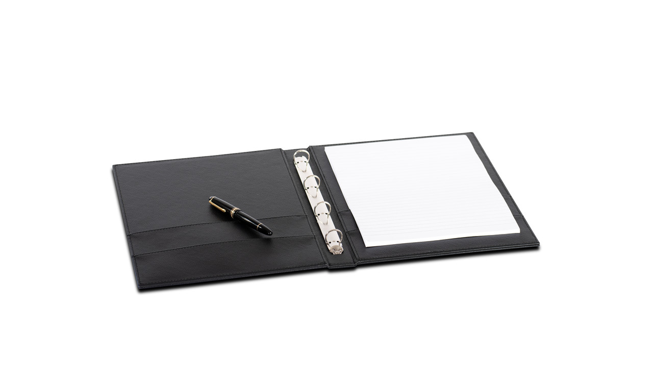 Real leather look with black stitching . Water repellant . Easy to clean. Four compartiments to store your information. Four ring binder for stable storage. Dim. 35 x 25 x 0,4 cm