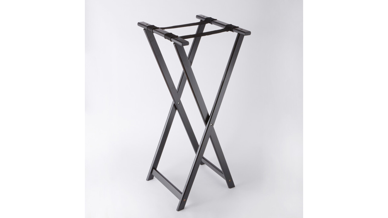 These black elegant foldable wooden tray stand opens with just one hand. They also fold for easy storage, feature nylon straps, holds heavy loads.