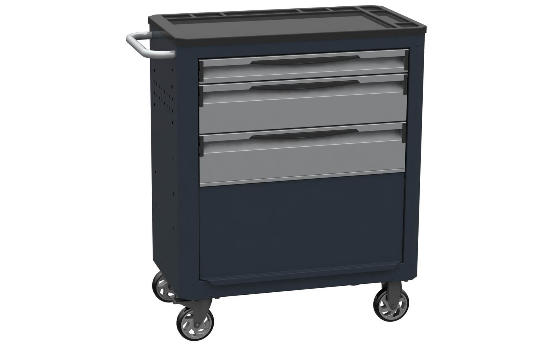Steel serving trolley including 3 drawers fitted on ball bearing slides and 1 compartment.