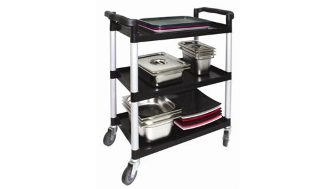 Solid polypropylene serving trolleys offering great strength for many applications in hotels, restaurants, hospitals, etc. Snap-in trash and cutlery tray sold separately. Use on flat surfaces.