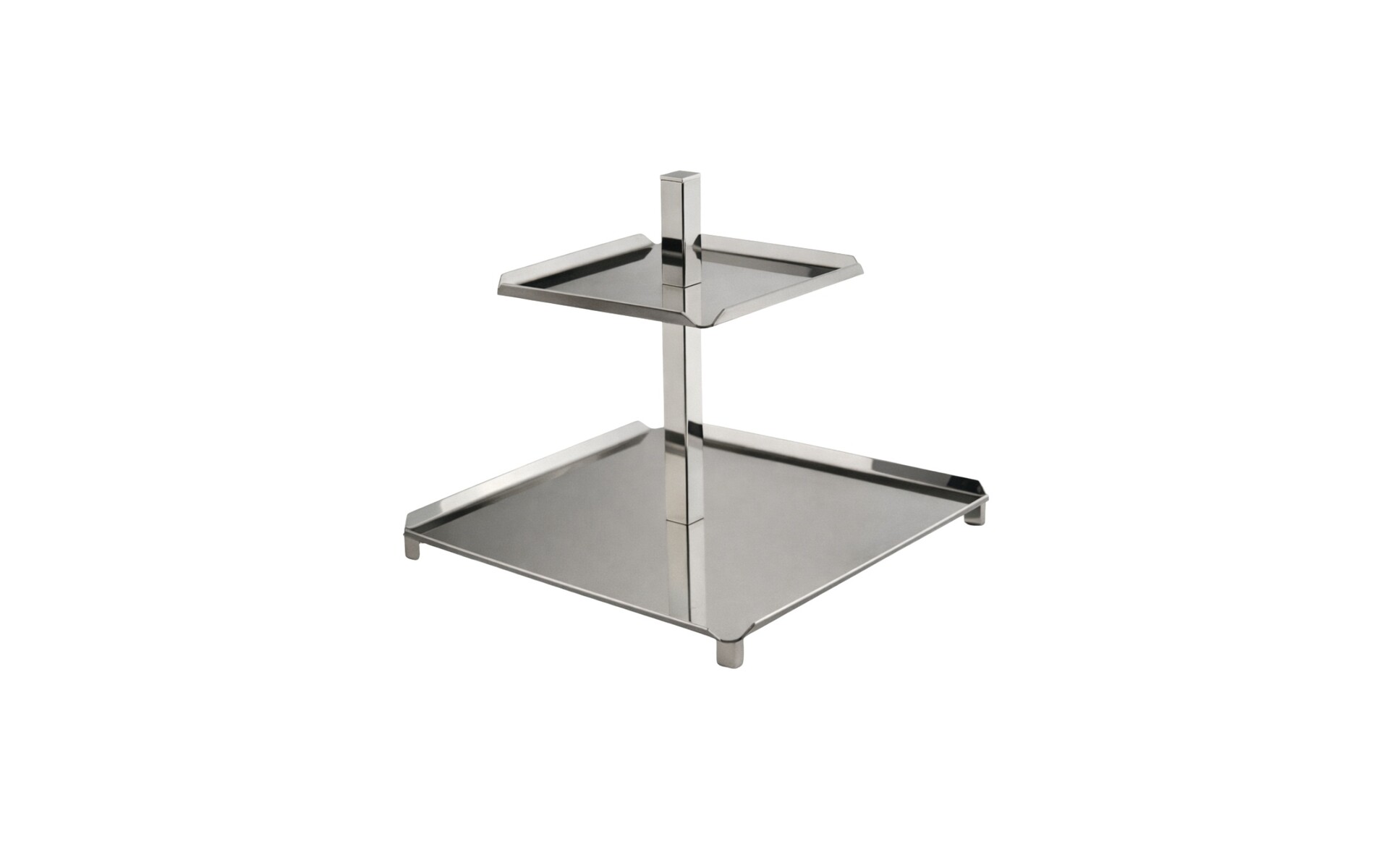 Elegant two-tier stainless steel serving stand, perfect for hotel breakfasts and buffet presentations. Its durable construction and modern design provide a stylish and practical way to display pastries, desserts, or snacks.