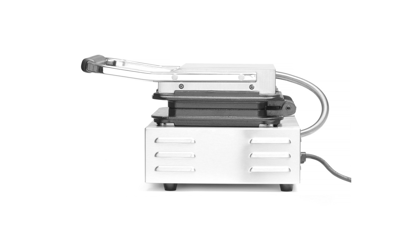 Liège waffles, two 3x5 rectangular patterns. Cast iron non-stick coated surface Thermostatic temperature control. Including waffle fork. Insulated handle.