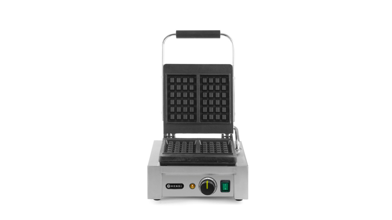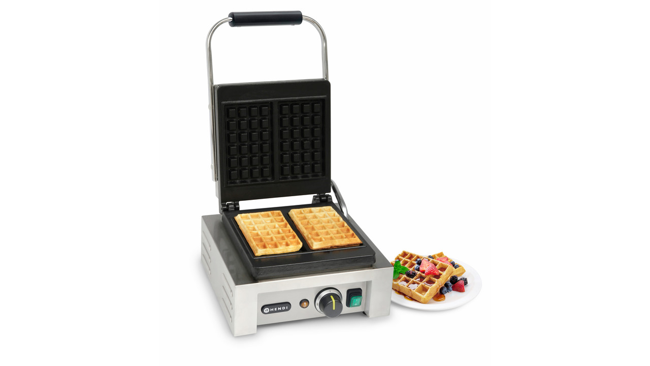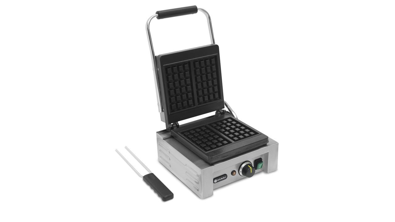 Liège waffles, two 4x6 rectangular patterns. Cast iron non-stick coated surface Thermostatic temperature control. Including waffle fork. Insulated handle.