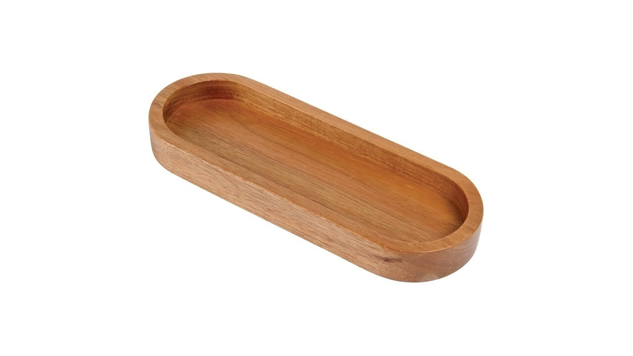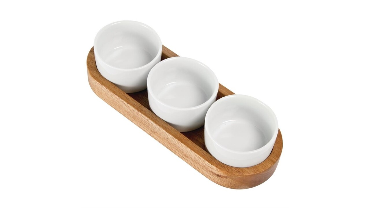 Serving loose ramekins of condiments can look untidy, not to mention being difficult to carry. With this tray, you can hold three ramekins at once for ease of carrying and serving at a table. Crafted from acacia wood, the fresh and rustic appearance of this tray looks great on a table as part of a platter. This wood is also incredibly robust and long-lasting, which saves you money on buying replacements.