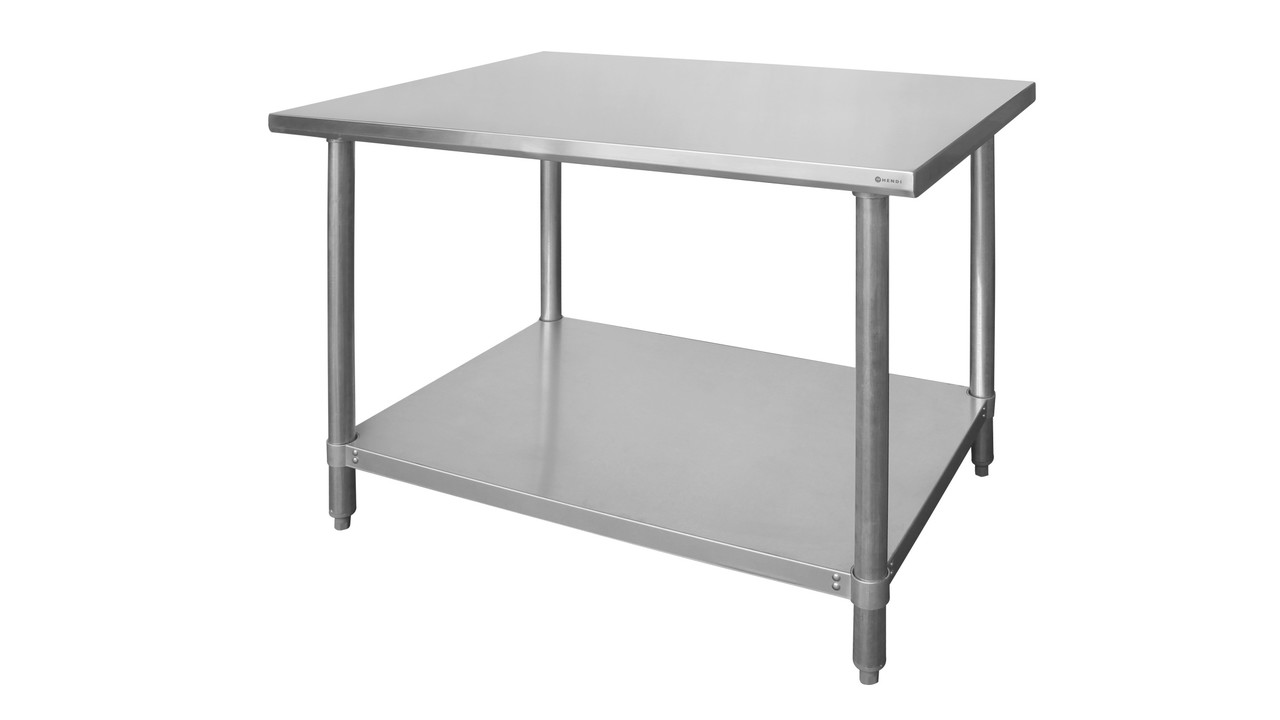 Worktop made from stainless steel, shelf from galvanaised steel. Height-adjustable legs. Robust construction.