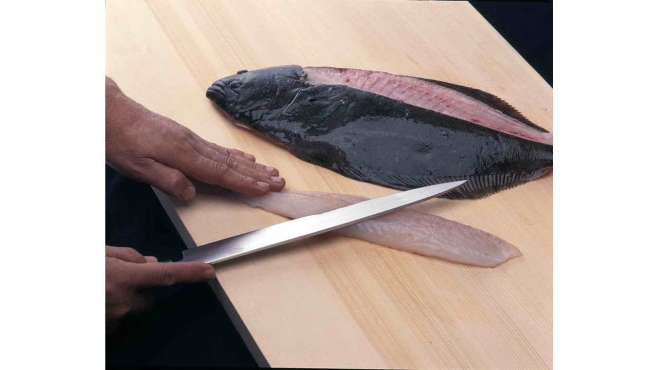 Resistant asymmetric blade made of molybdenum/vanadium stainless steel. Wooden handle with black bolster. Traditional Japanese knife, ideal for cutting bones and cutting fish. Very sharp. Not dishwasher safe.