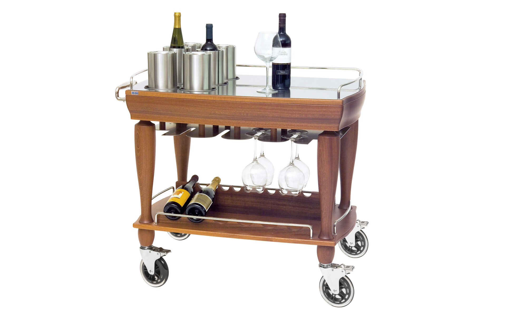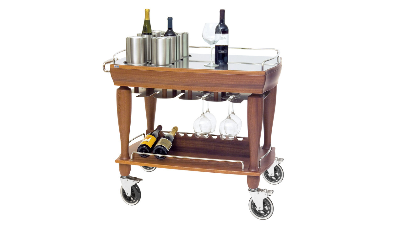 Upper working surface in stainless steel 18/10, 6 pieces insulated wine coolers included, a glass and a bottle holder on the lower level Made of high quality wood available in tanganica, walnut, mahogany, rosewood en wengé finish
