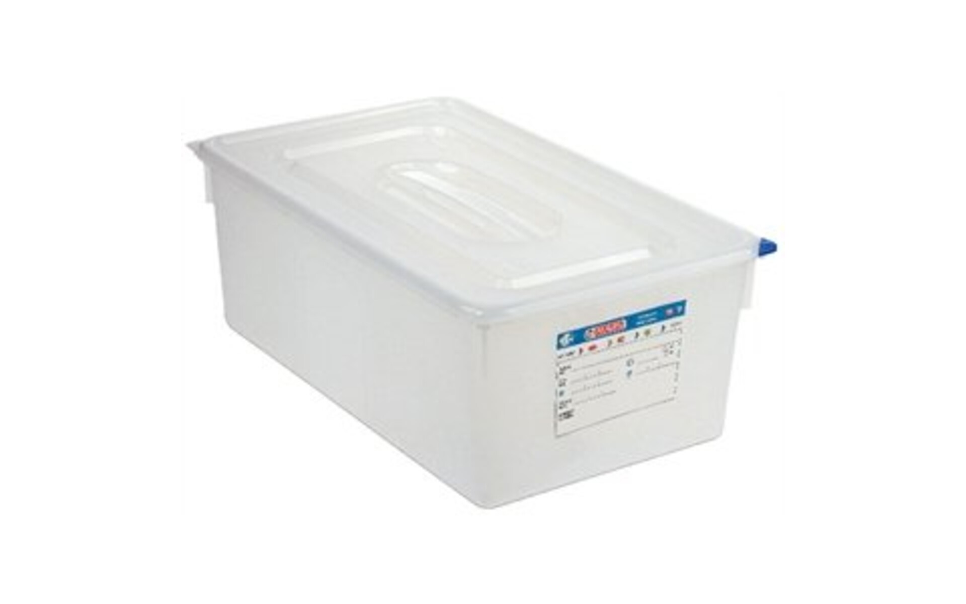 Boîte hermétique codée par couleur avec couvercle. Vendues avec un ensemble de clips codés par couleur (rouge, jaune, vert et bleu). Contenance : 21 litres Plage de température comprise entre -40°C et 95°C.