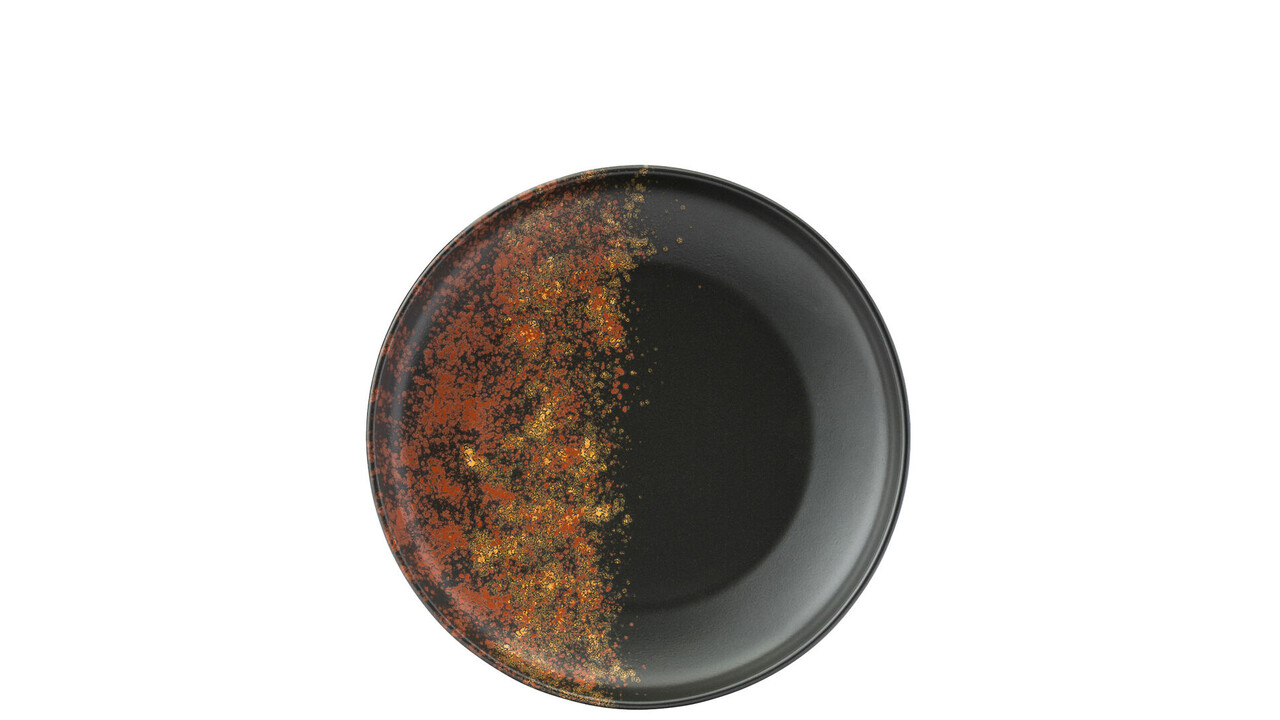 Oxy est une collection d'inspiration orientale. Chaque pièce est réalisée sur une base en émail satiné foncé, ornée de motifs teintes flamboyantes appliqués à la main, pour un effet saisissant. Compatible lave-vaisselle, convient à un usage professionnel.