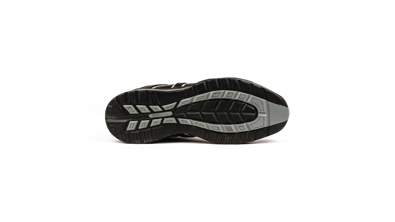 Chaussures noires avec embout renforcé, semelle anti-glisse et anti-statique. Semelle polyuréthanne double densité et dessus en cuir. Résistant aux huiles et aux graisses.