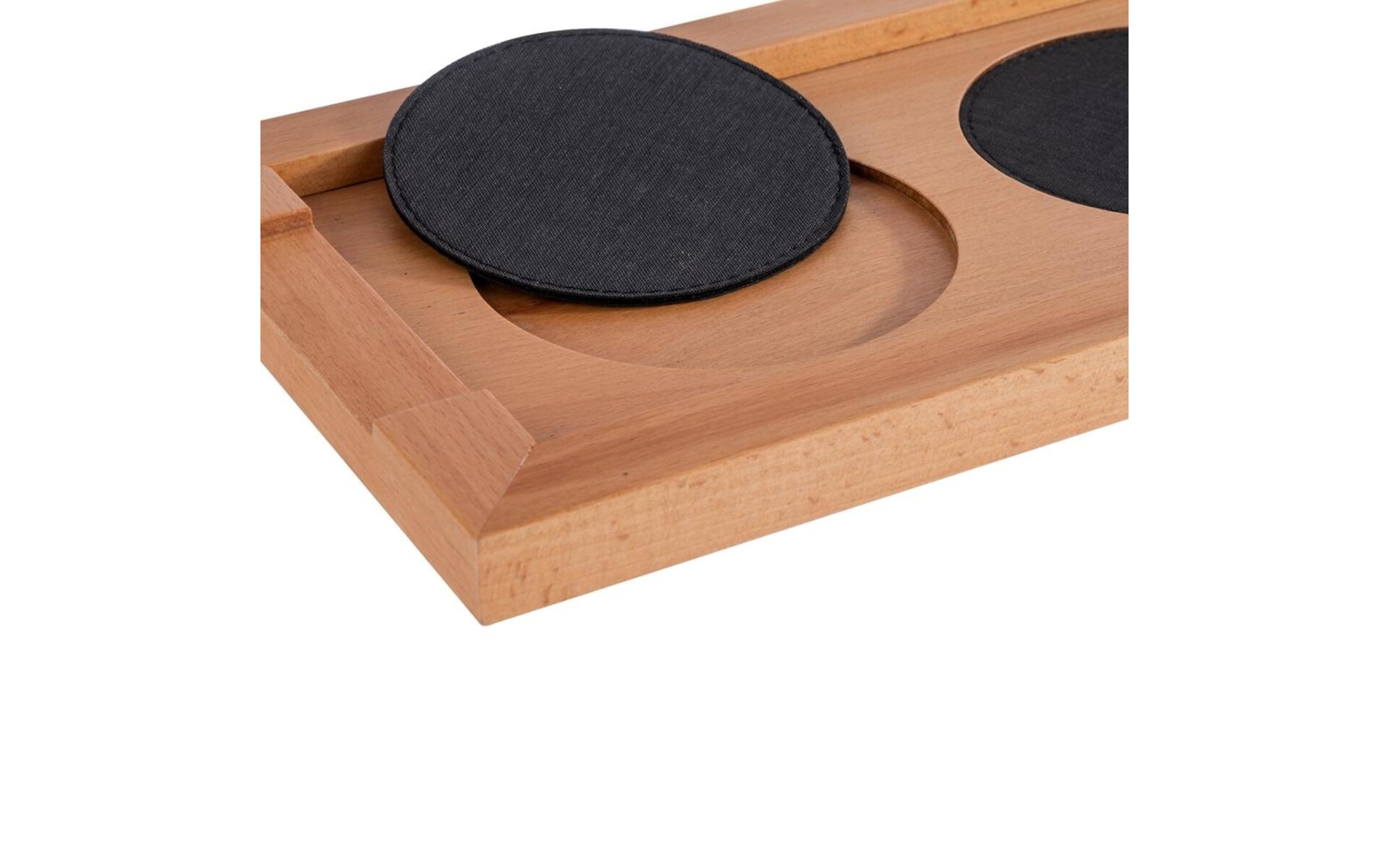 Dimensions de la planche : 47 x 19 x h 2 cm. Contenance des bouteilles 1 litre. La planche est livrée avec 3 inserts en cuir synthétique diam. 11 cm