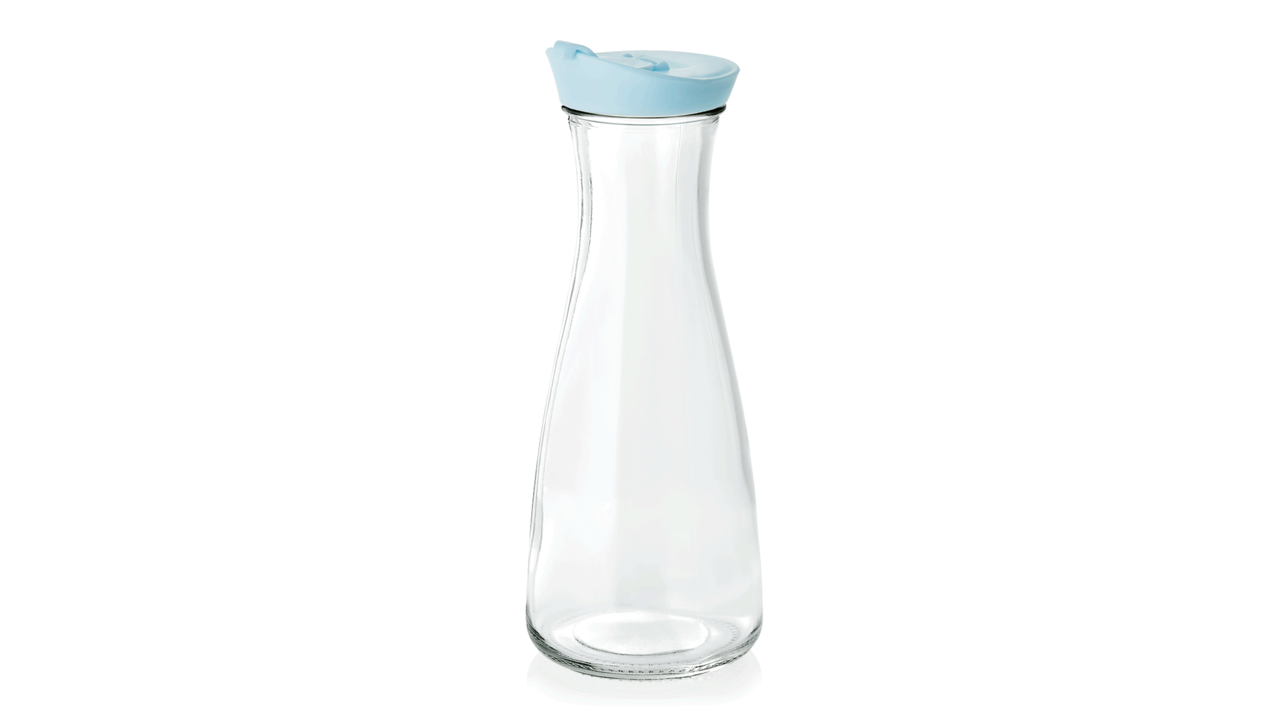 Cette bouteille en verre est fabriquée en verre trempé extra résistant. Equipé d'un bouchon bleu, idéal pour servir de l'eau sur un buffet petit-déjeuner !