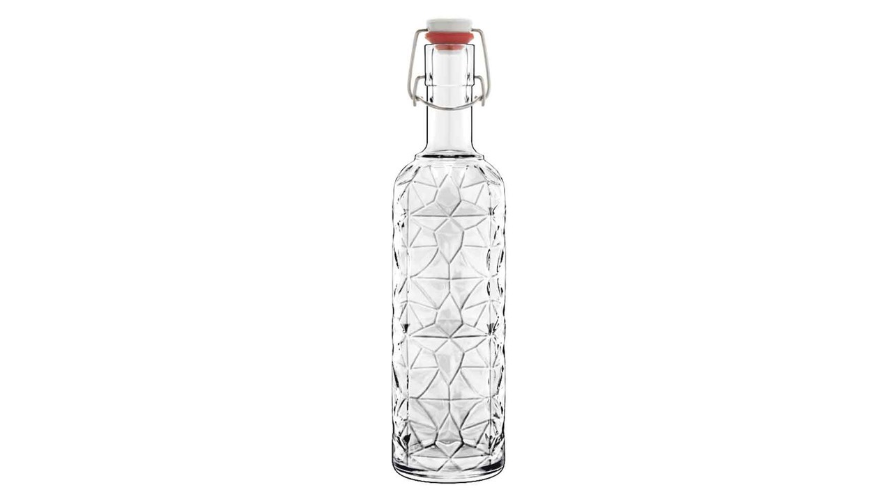 Verre pressé très robuste Élégant décor relief lumineux Bouchon articulé Couleur transparente Contenance 1 Litre Dimensions: ø85 X 340mm (h)