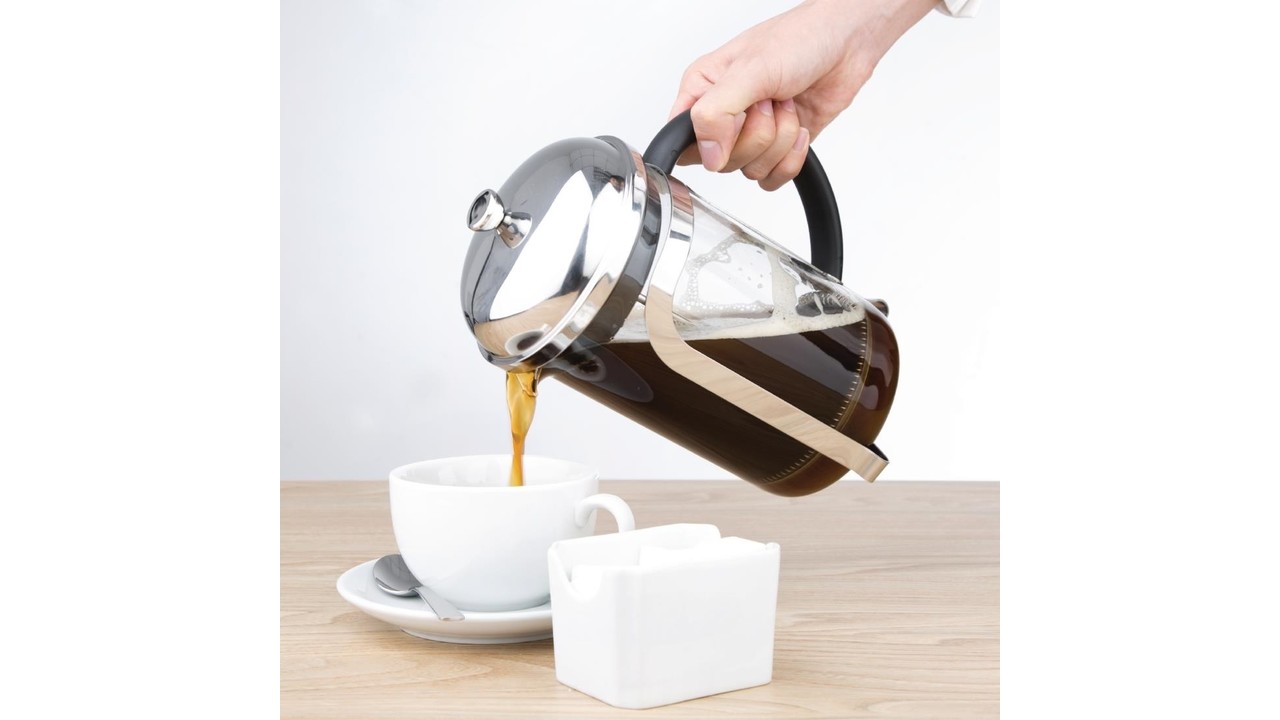 Cafetière à piston avec filtre en acier inoxydable de forme améliorée pour une meilleure circulation de l'eau. Le filtre et le récipient en pyrex résistant aux chocs thermiques sont amovibles pour un nettoyage facile. Couvercle en acier inoxydable.