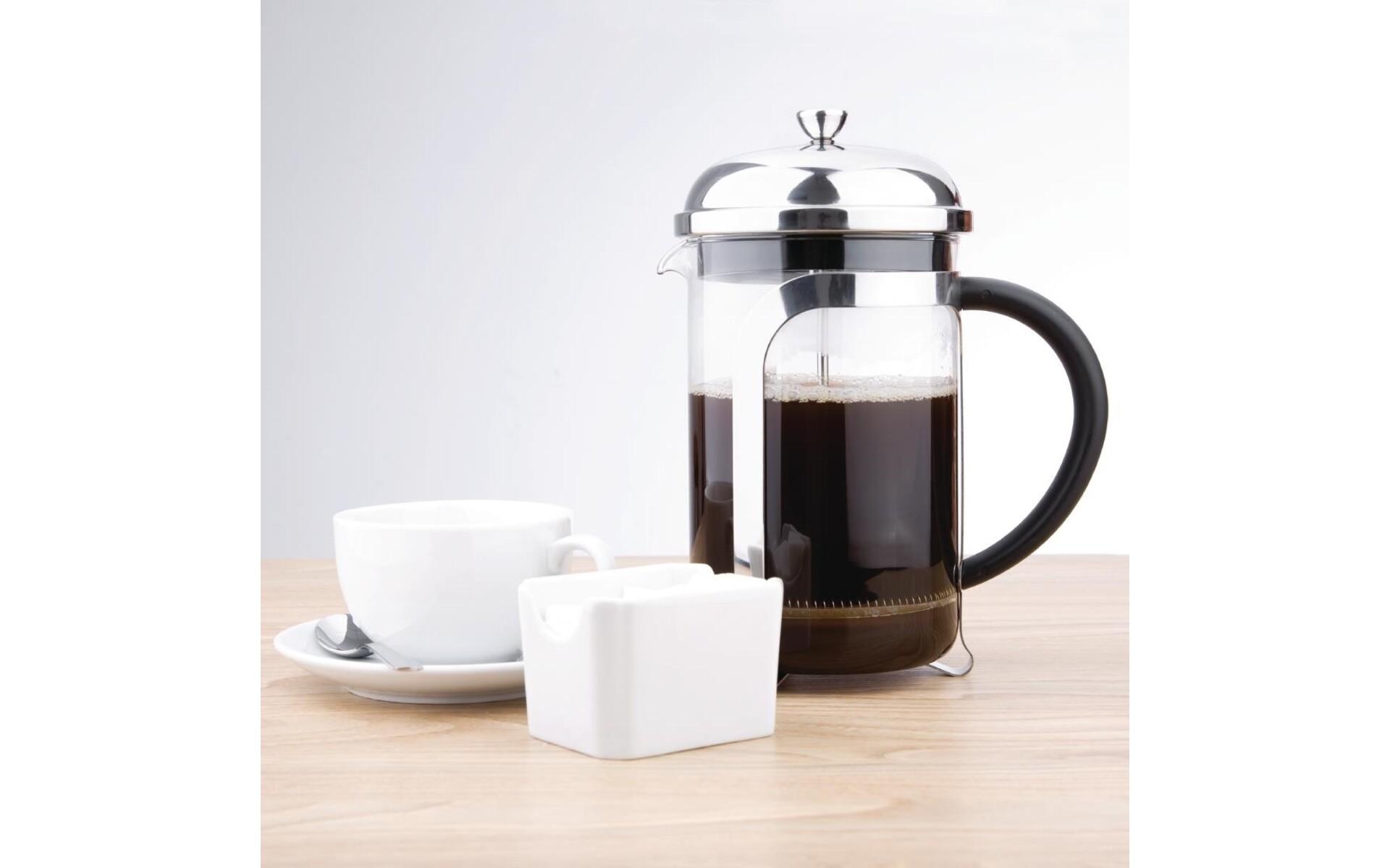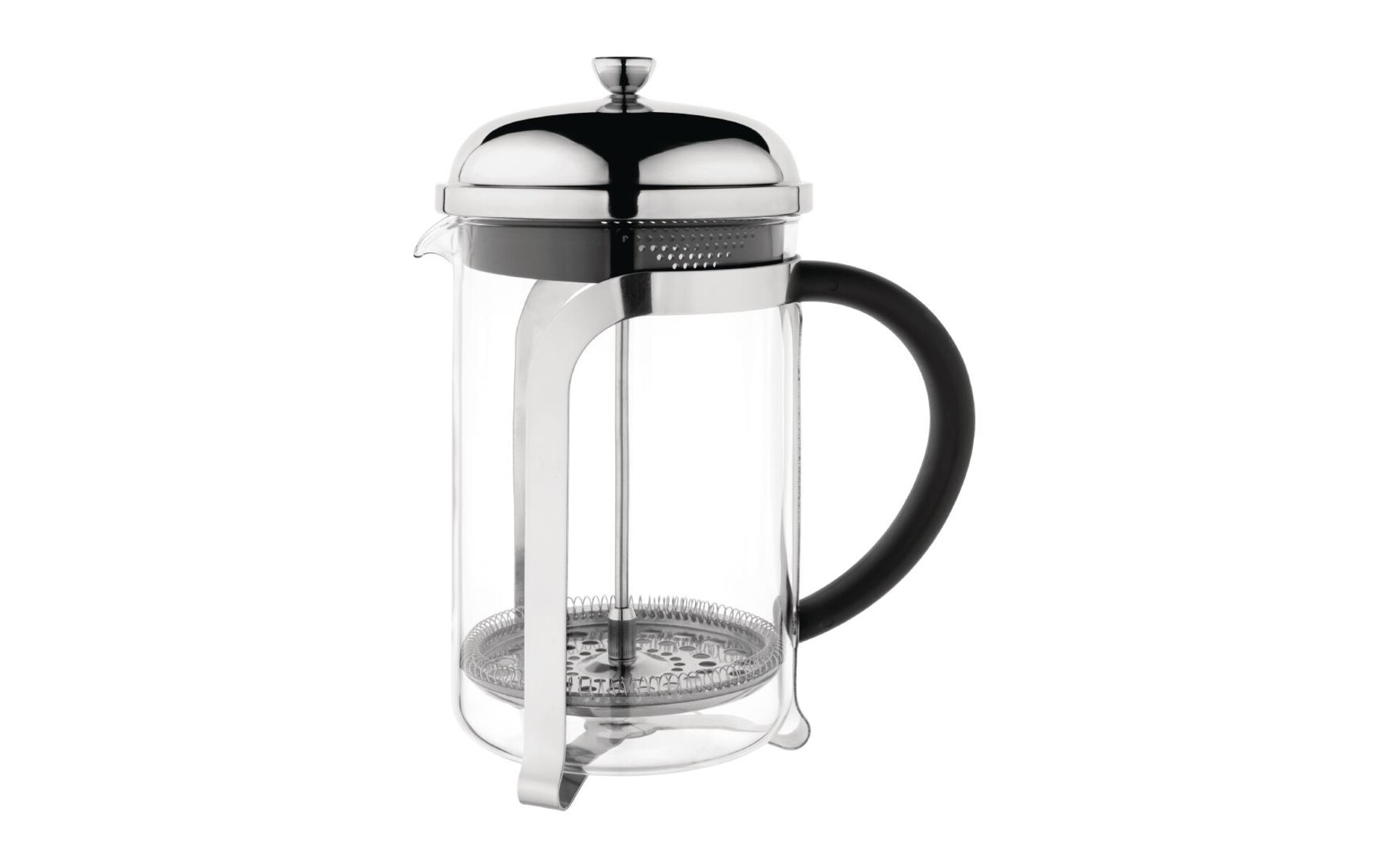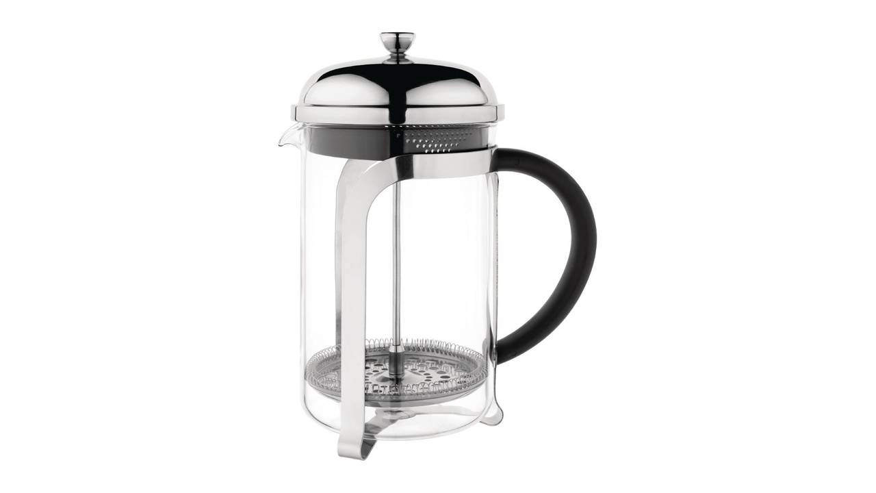Cafetière à piston avec filtre en acier inoxydable de forme améliorée pour une meilleure circulation de l'eau. Le filtre et le récipient en pyrex résistant aux chocs thermiques sont amovibles pour un nettoyage facile. Couvercle en acier inoxydable.