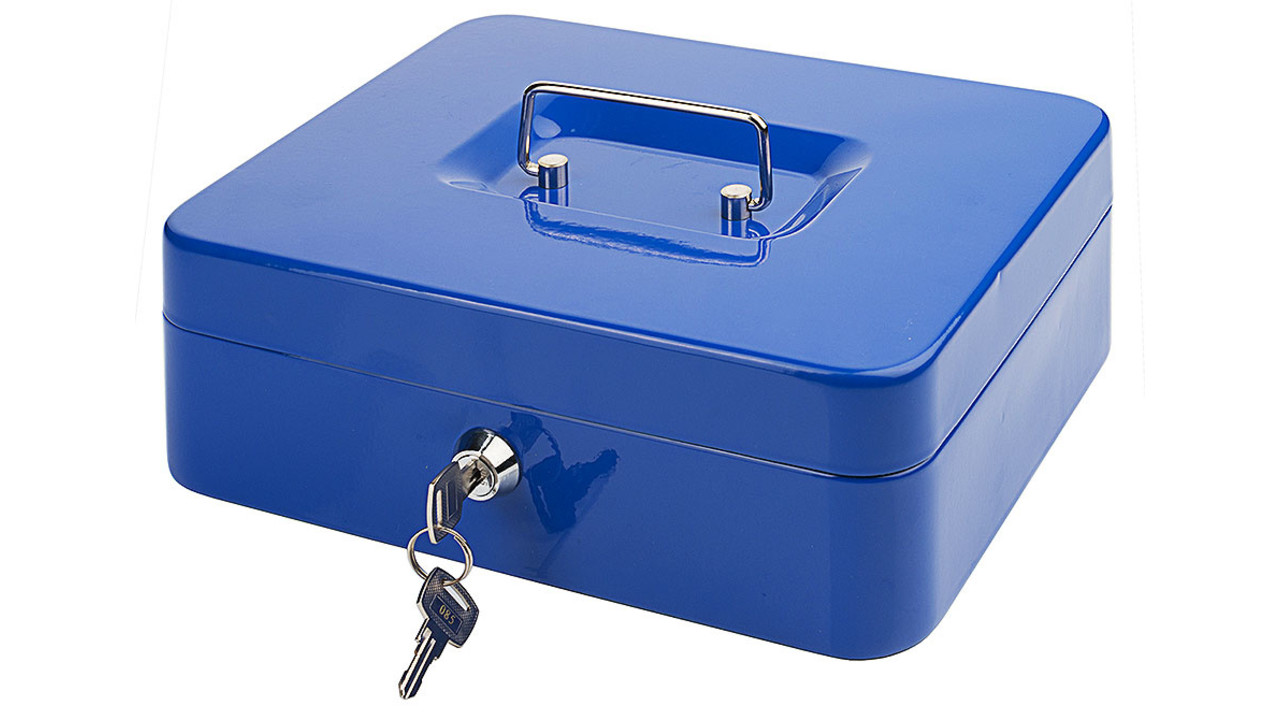 Dim. 25 x 18 x h 9 cm. Acier laqué, avec serrure à cylindre, équipé de 2 clés, avec porte-monnaie en polystyrène à 5 compartiments, couvercle avec poignée mobile