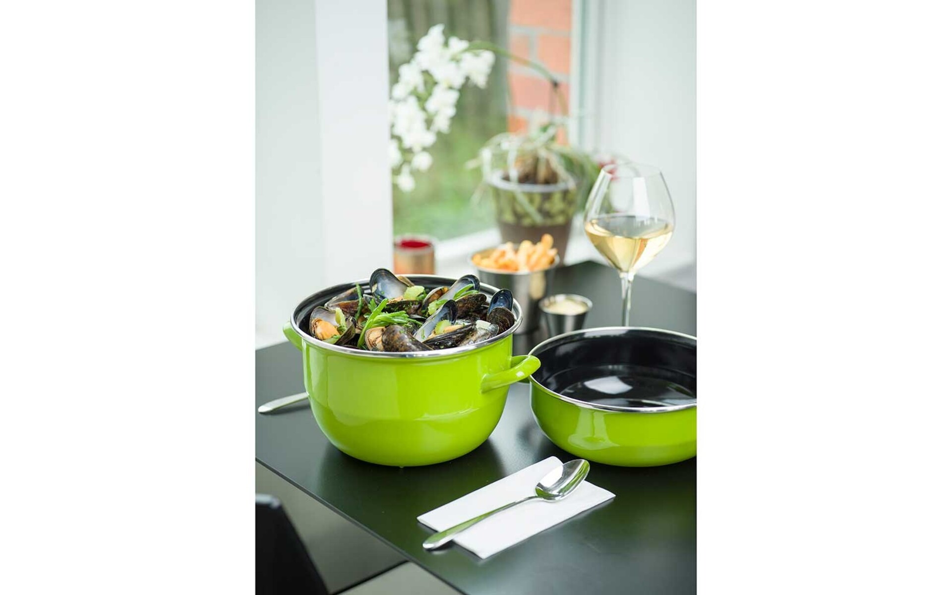 Casserole à moules couleur verte pour servir 1 kg de moules