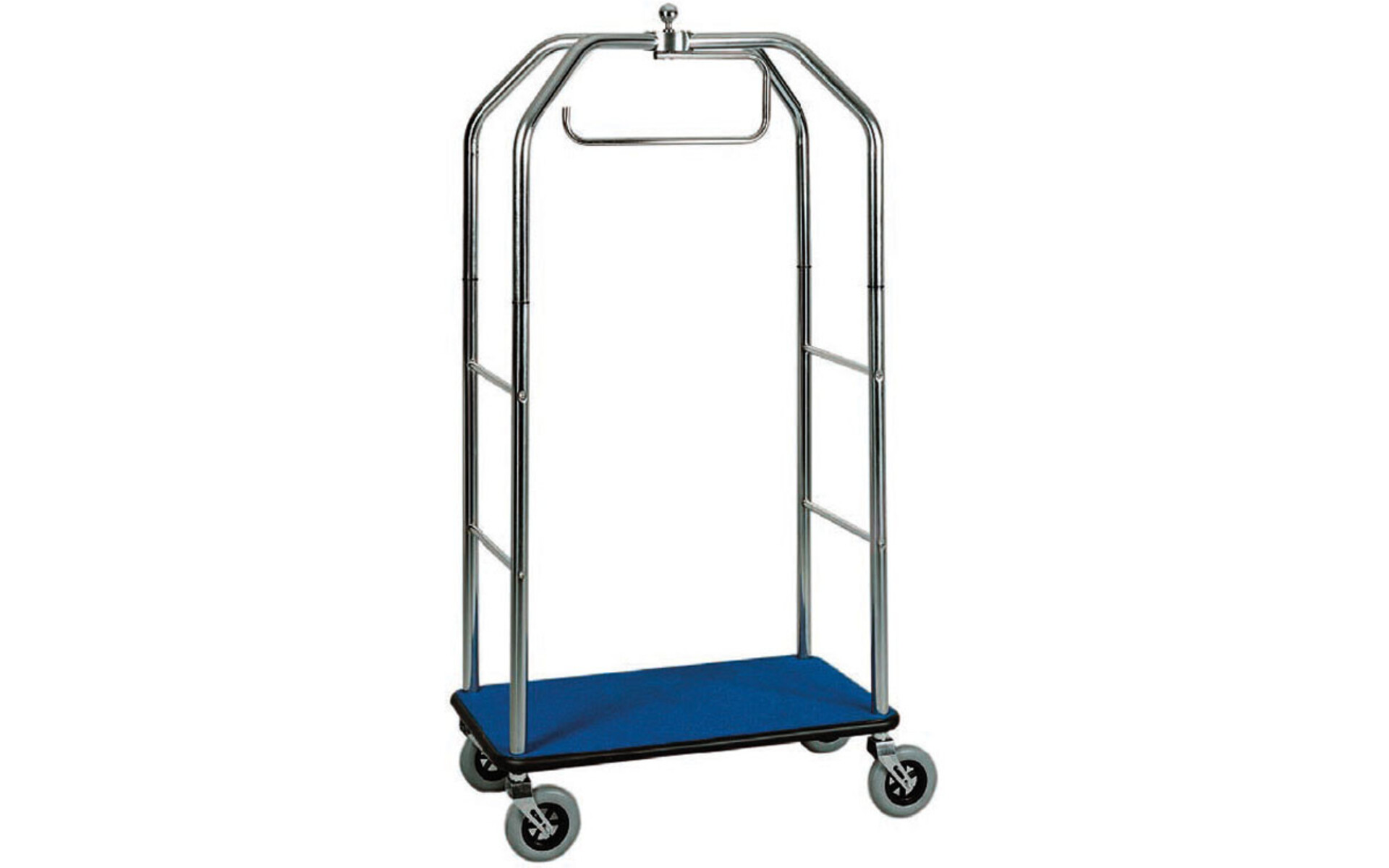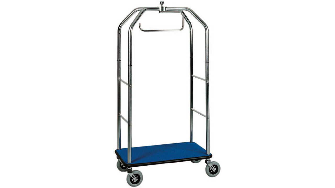 Chariots à bagages et porte-vêtements. Base en bois recouverte de moquette colorée, disponible en rouge ou bleu – support de tige en tube d'acier laitonné ou chromé ø 40 mm – amortisseur périphérique en caoutchouc – roues multidirectionnelles ø 200 mm.