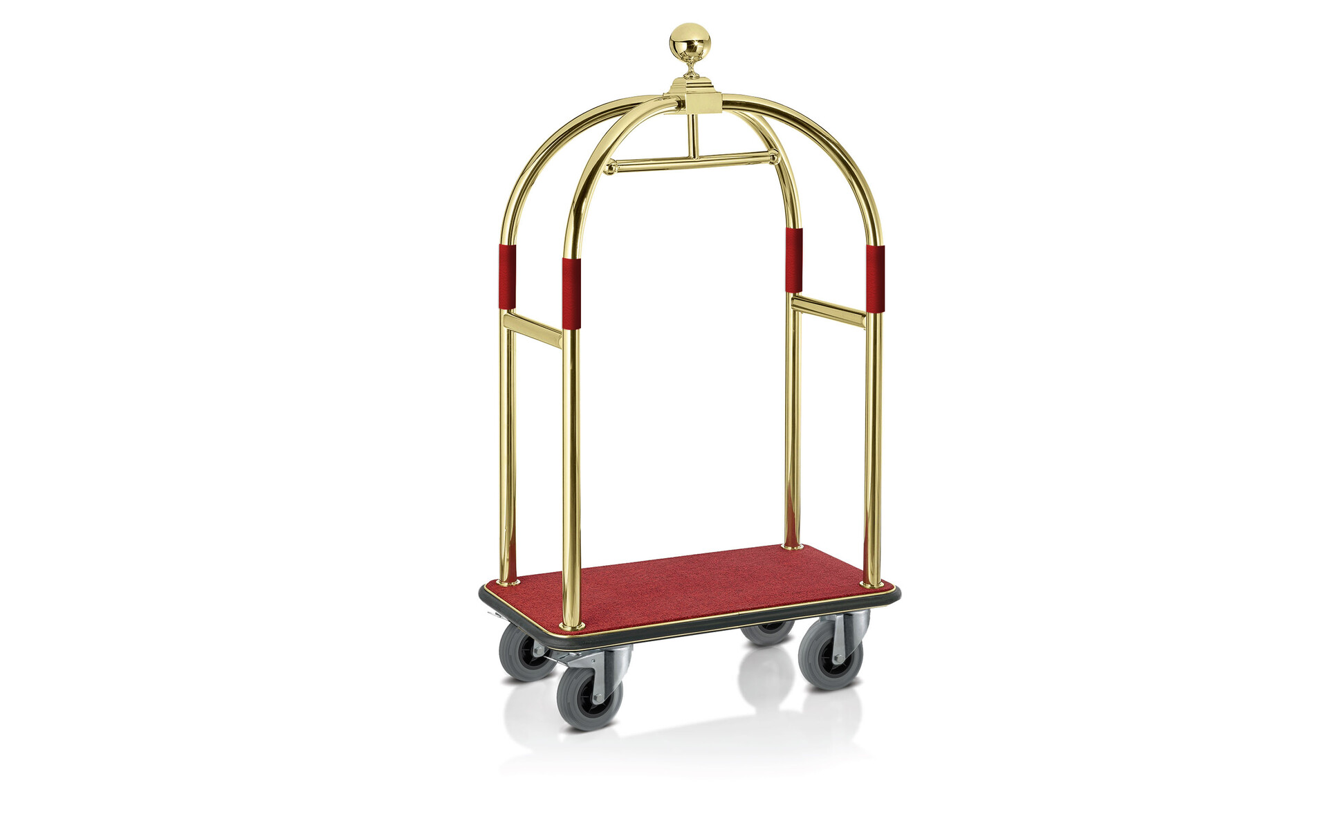 Le chariot à bagages Paris est doté d’une structure en acier inoxydable brossé avec plateforme en tapis, protections et pare-chocs en caoutchouc. Les roues silencieuses Ø200 mm (2 fixes, 2 pivotantes avec freins) assurent une maniabilité fluide, avec une