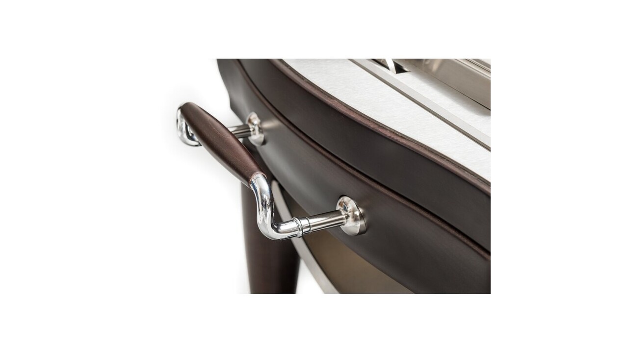 Finition PARIS noyer. Dim. 116 x 80 x h 118 cm. Poids : 95 kg. Finitions disponibles : acajou, palissandre, noyer et wengé. Cloche roll top en acier inoxydable 18/10, avec système de rotation autobloquant dans toutes les positions.