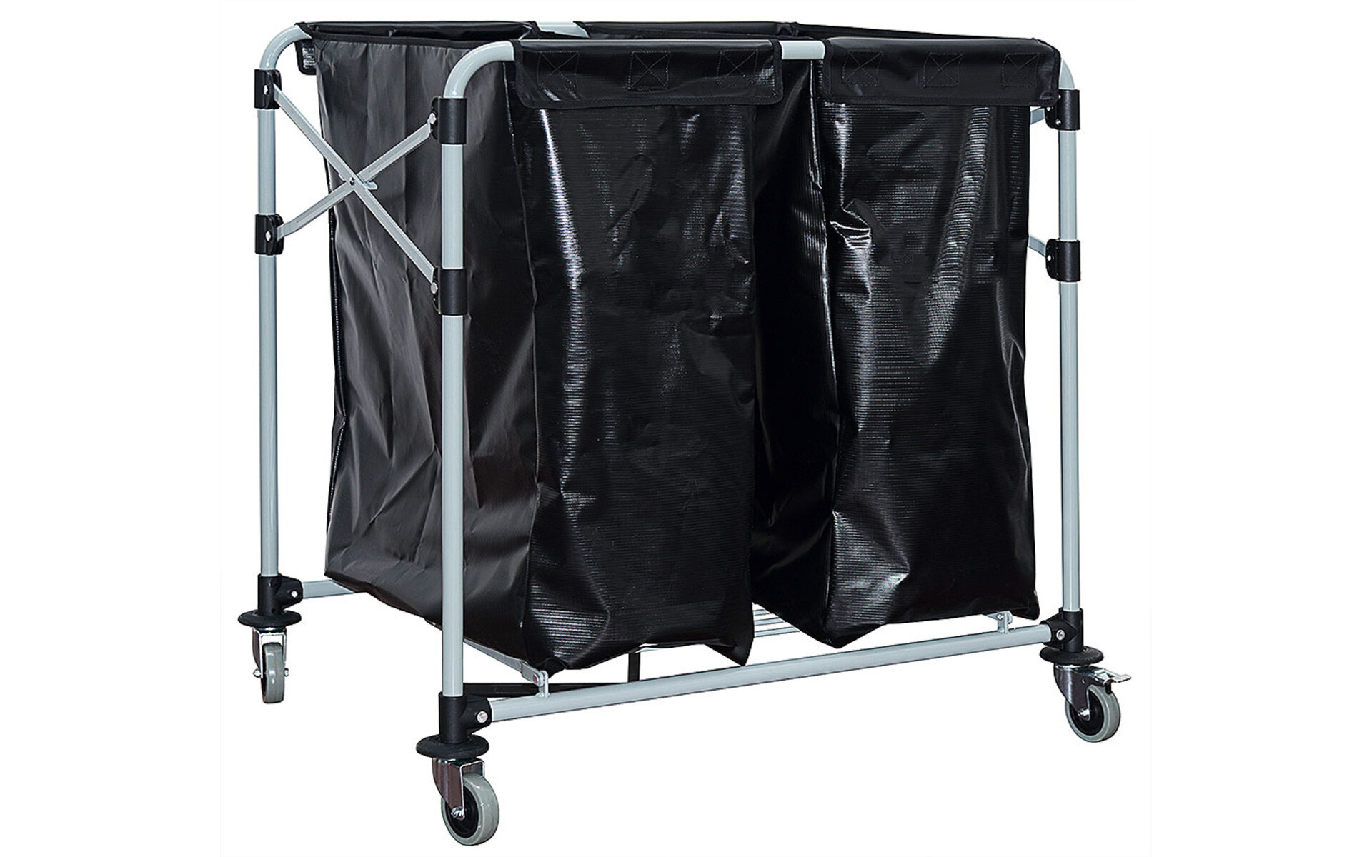 Châssis en tube d'acier laqué gris avec sacs en plastique renforcés de tissu noir à charnières, Capacité 2 x 150 litres.