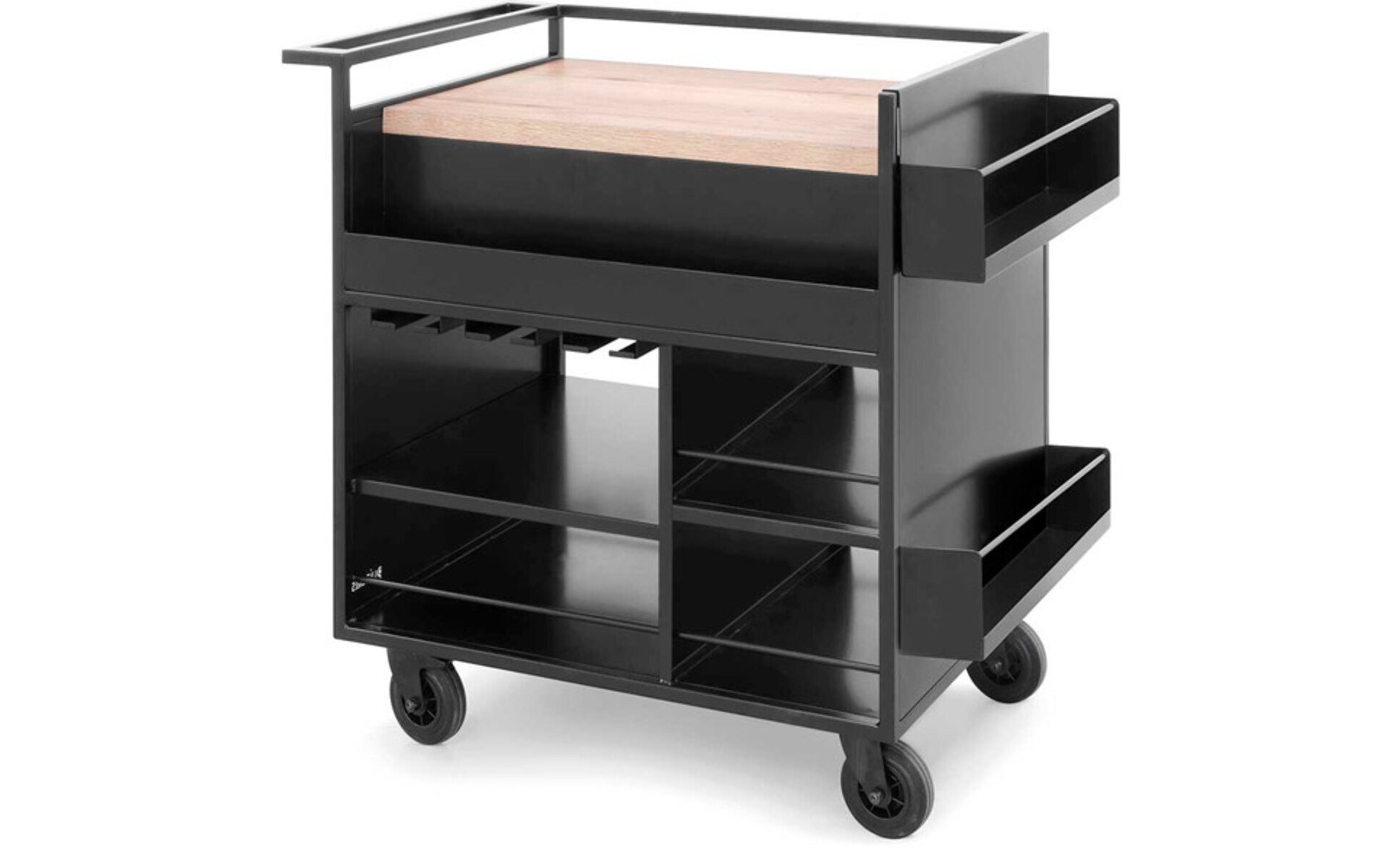 La conception comprend trois rails pour suspendre les verres, des étagères spécifiques pour les mixeurs et un espace dédié pouvant accueillir jusqu'à 20 verres à boissons. De plus, il dispose d'étagères latérales pour ranger les bouteilles, le tout sur une structure de peinture noir satiné qui garantit durabilité et look distinctif.