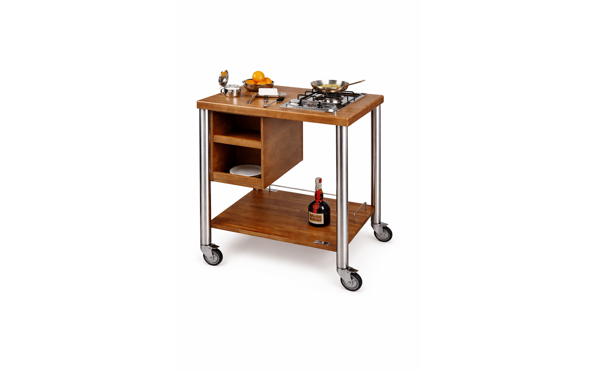 Le chariot dispose d’un plateau robuste adapté aux équipements de cuisson, d’une étagère inférieure pour le rangement et d’un porte-assiettes pour un service organisé.