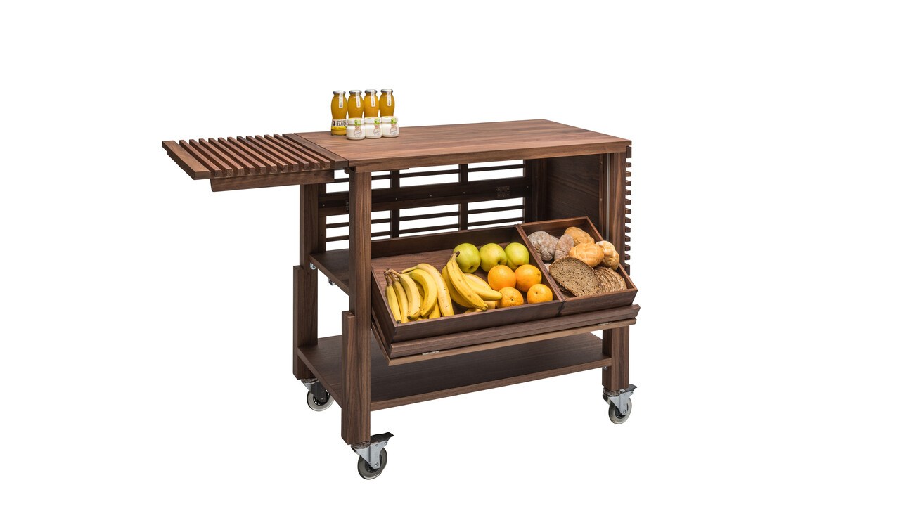 Ce chariot est composé de deux volets latéraux adaptés à l'extension du plateau supérieur. Les grilles avant et arrière rabattables forment deux surfaces inclinées des deux côtés pour positionner deux plateaux GN 1/1 et deux plateaux GN 1/2, inclus dans le prix.