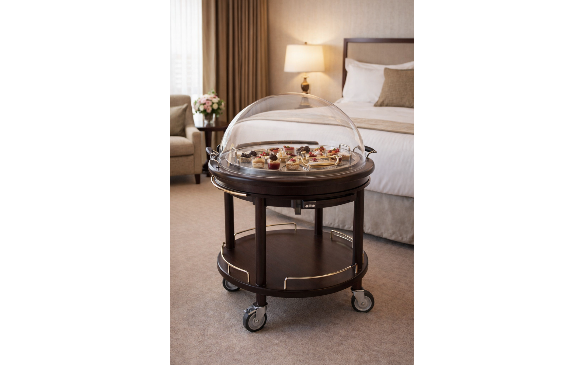 Le chariot ROMA Round Top Dessert est conçu pour la présentation élégante de desserts et hors d’œuvres froids. Son plateau supérieur rond réfrigéré garantit fraîcheur et mise en valeur des produits.